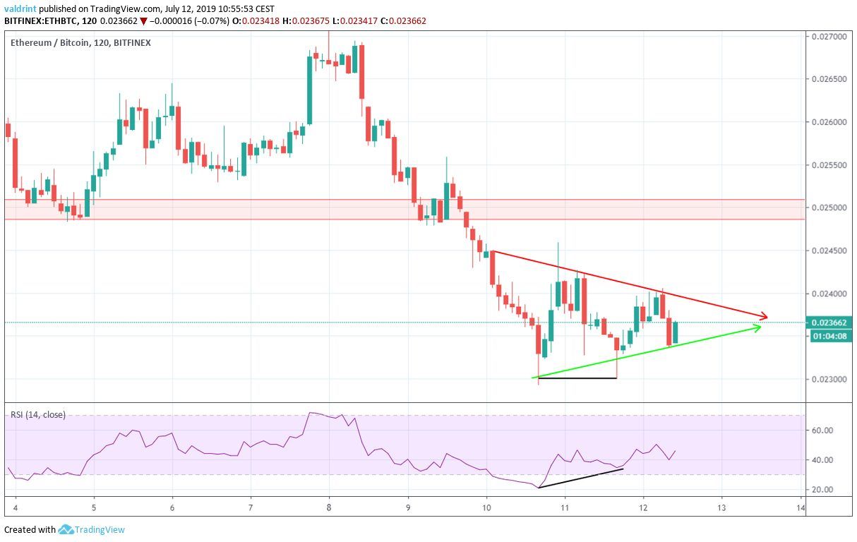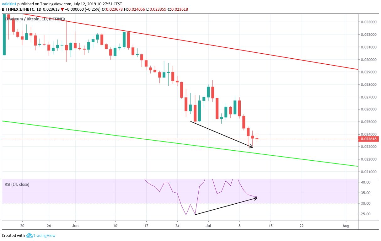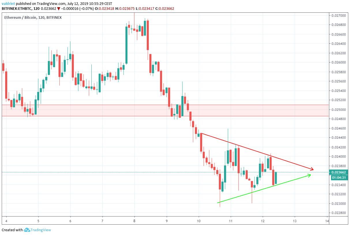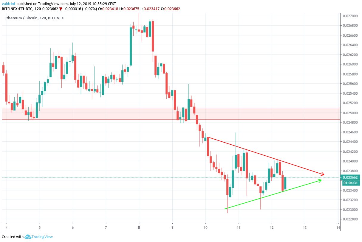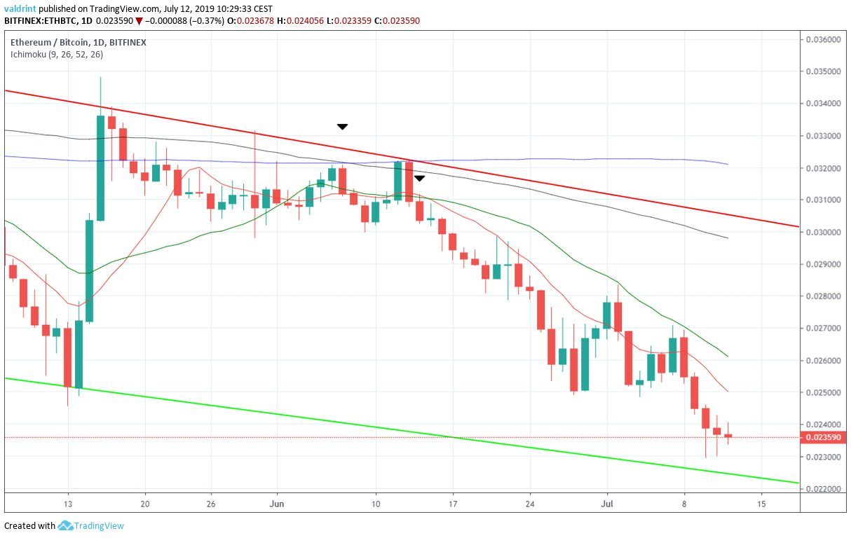 On July 9, 2019, the Ethereum price reached a high of ₿0.029. A rapid decrease ensued, and the price reached lows close to ₿0.023 the next day. ETH reached similar values on July 11 and 12.