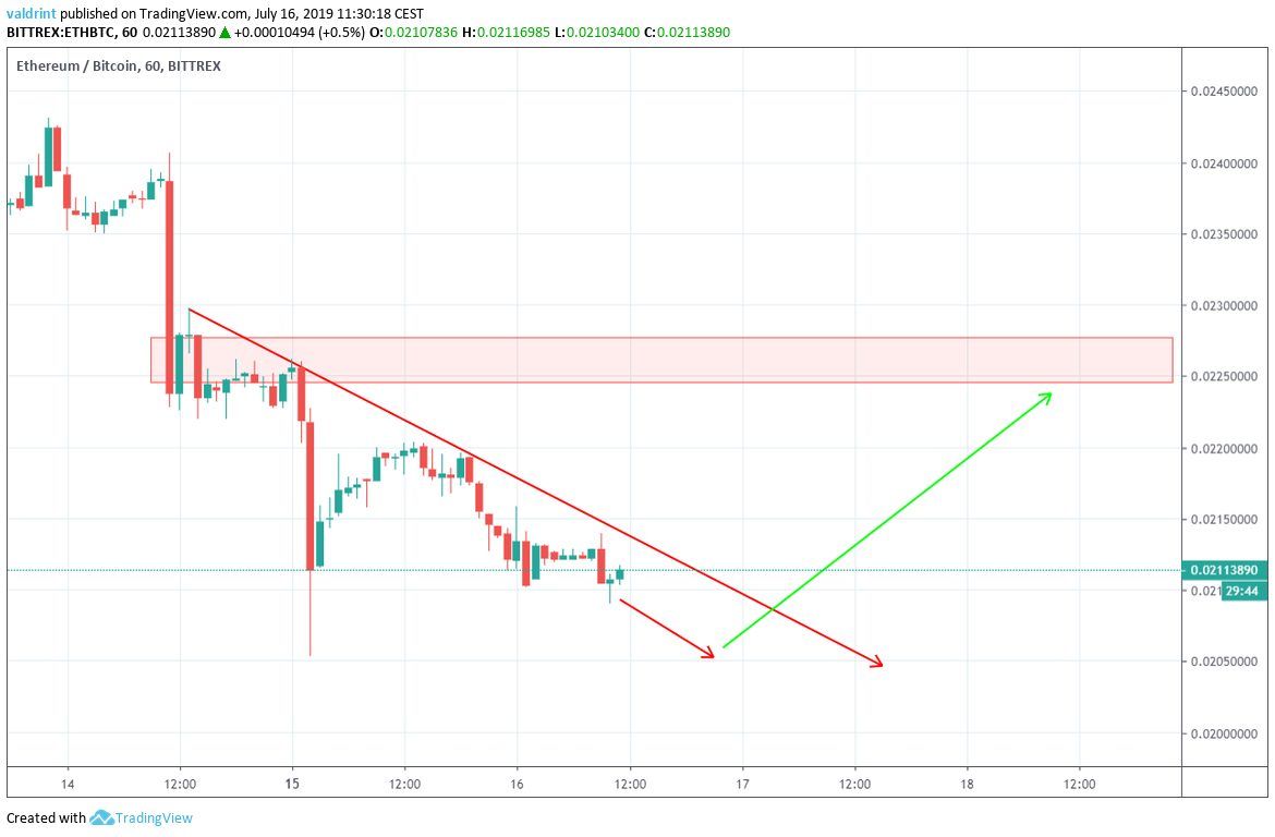 Between July 10 and 13, ETH traded inside a symmetrical triangle. The price broke out from the triangle and reached a high of ₿0.0243 before a rapid decrease began.