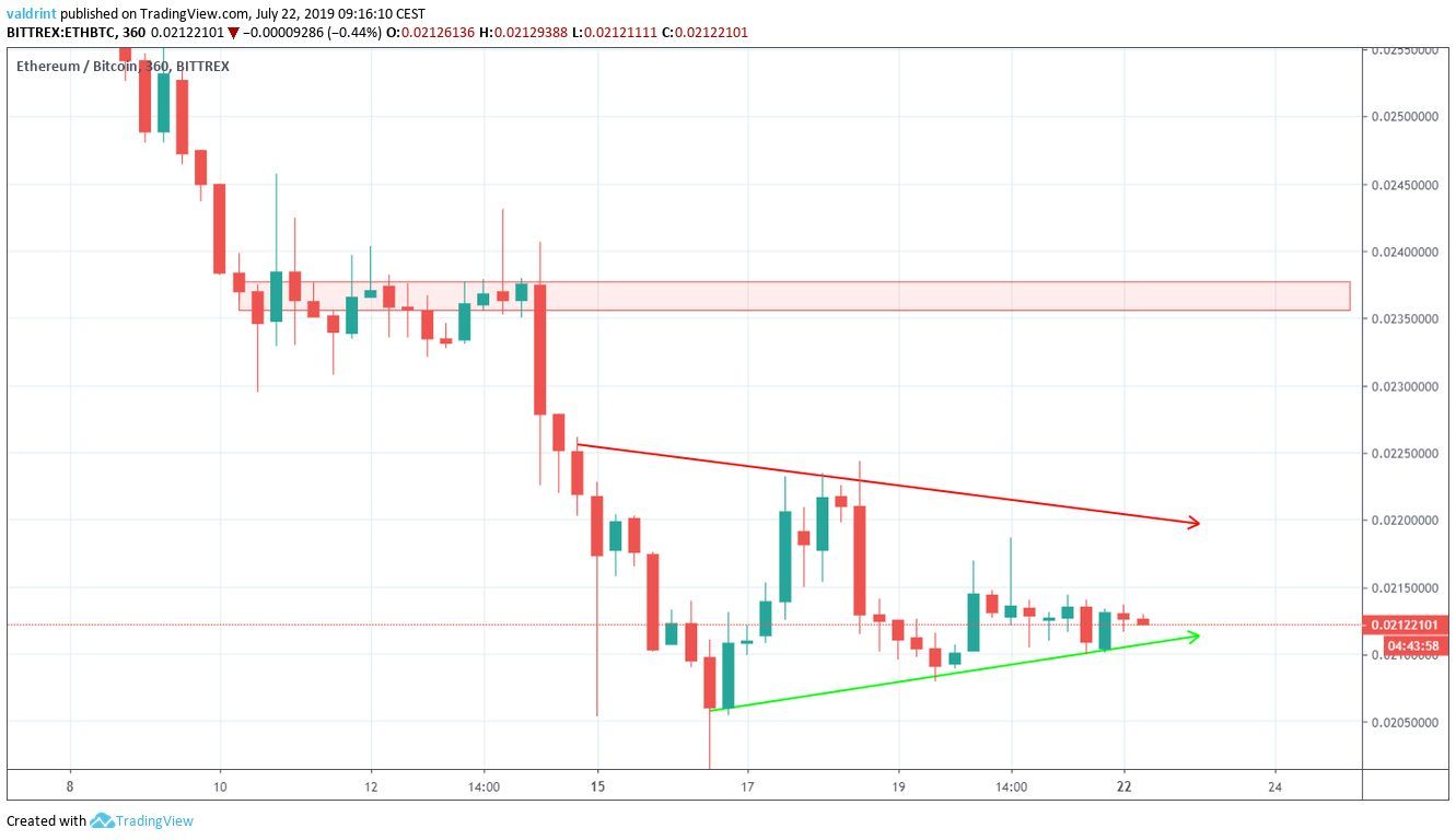 On July 15, 2019, the Ethereum price reached a high of ₿0.024. A rapid decrease ensued. The next day, it reached lows slightly above ₿0.020. It has been slowly increasing since.