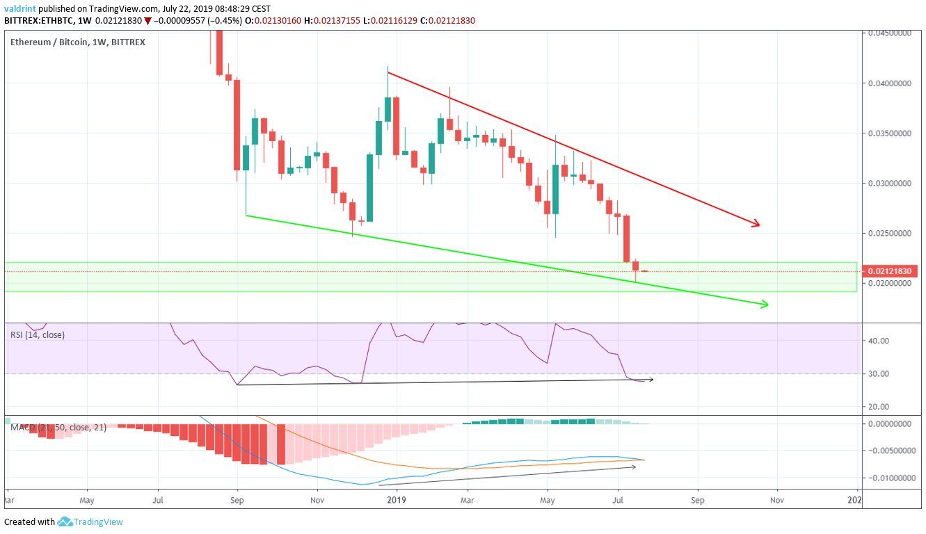 First, we can see that the Ethereum price has been trading inside a descending wedge since July 2018.