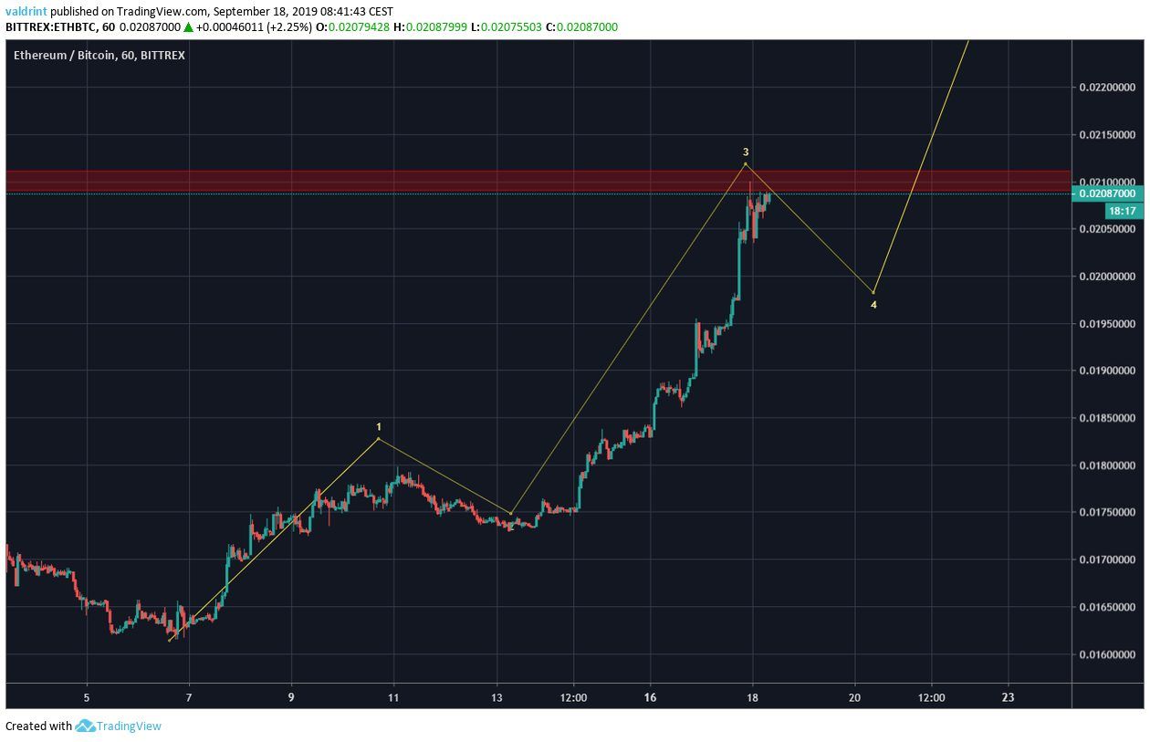 Looking at the hourly time-frame, we can see that ETH is likely in the third wave of a five wave Elliott formation.