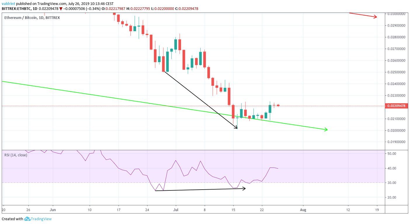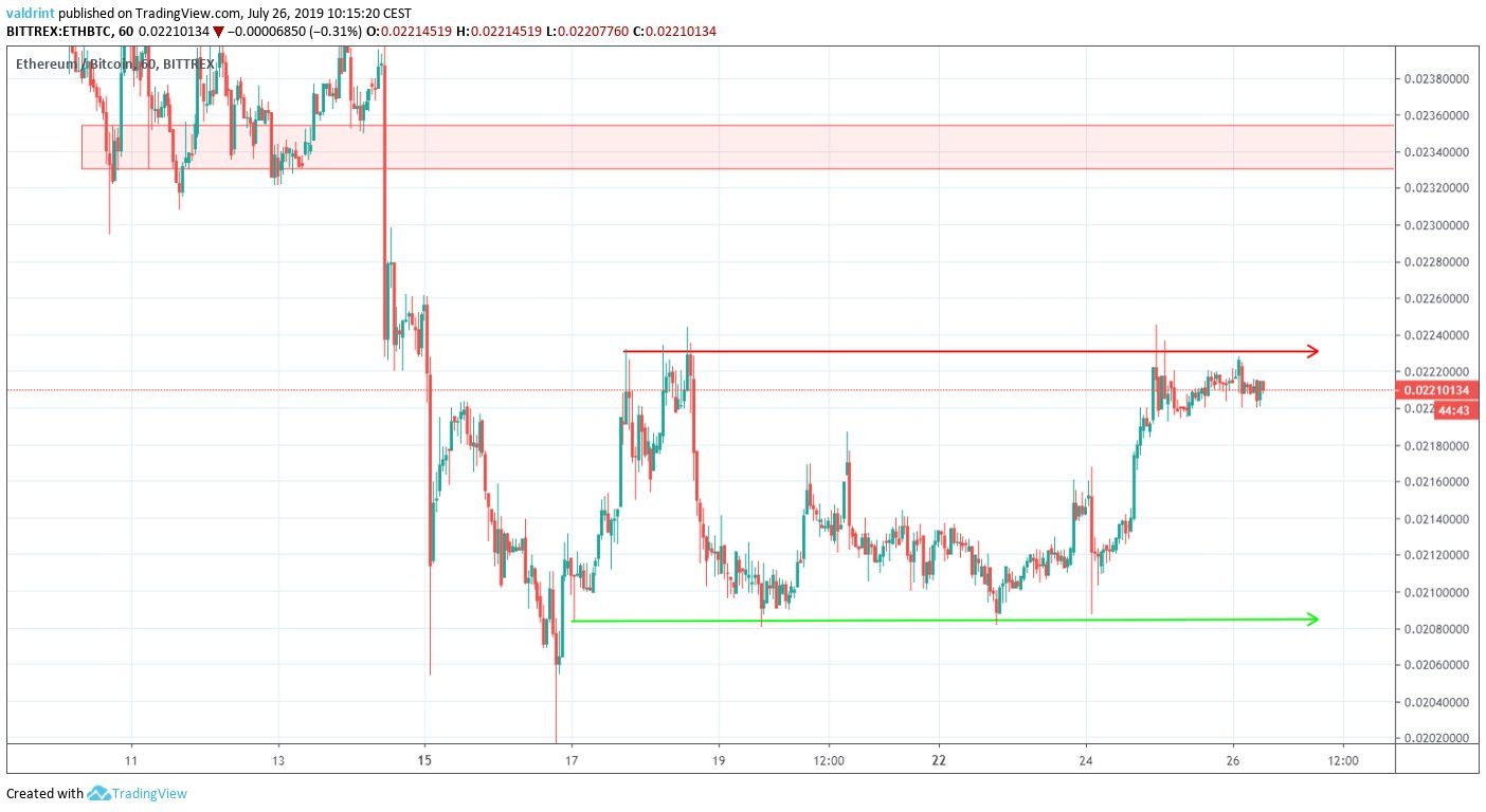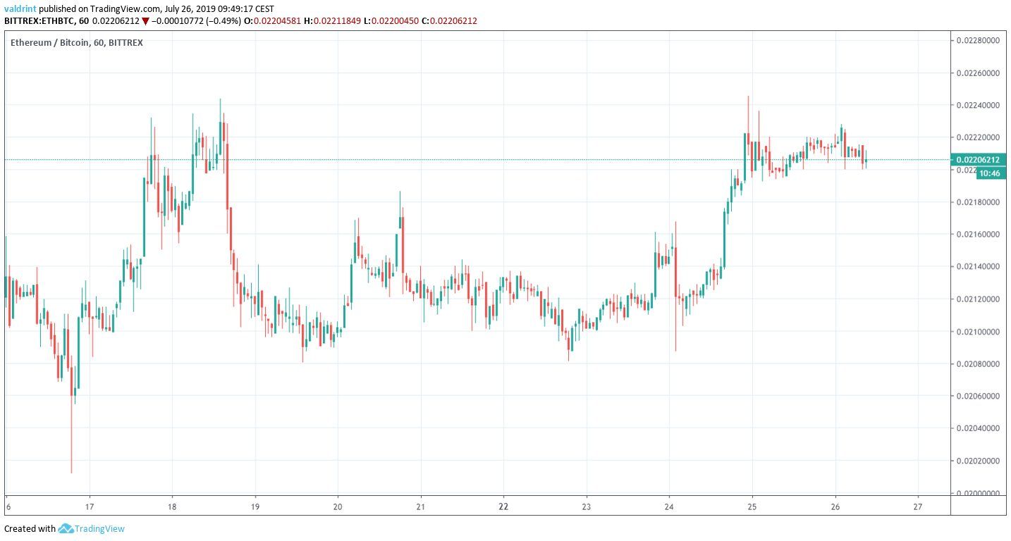 On July 16, 2019, the ETH price hit lows of ₿0.020. An upward move began and the price reached highs of ₿0.0224 the next day. After a slight decrease, the price reached similar highs on July 25.