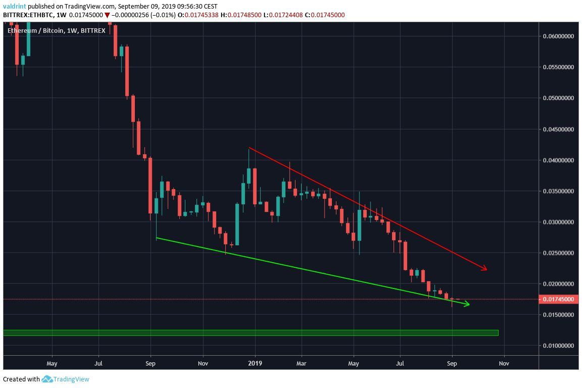 A look at the weekly chart shows that Ethereum has been decreasing since June of 2017.