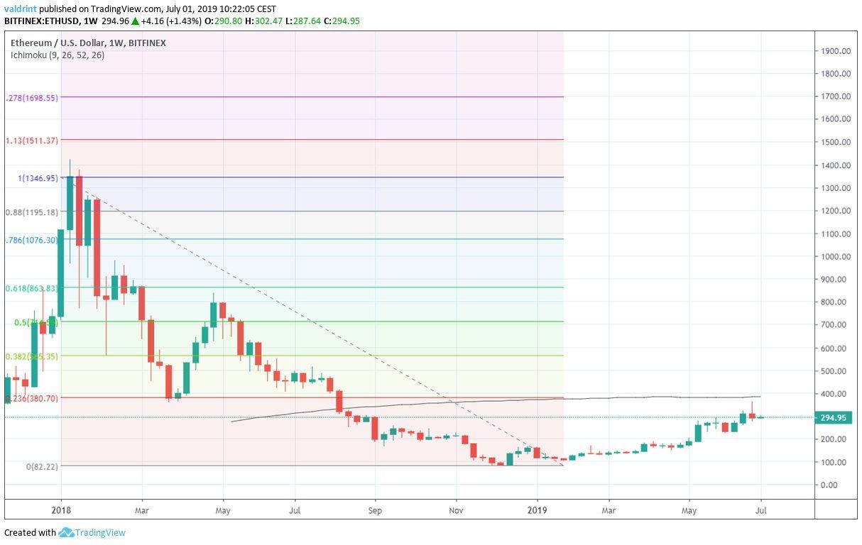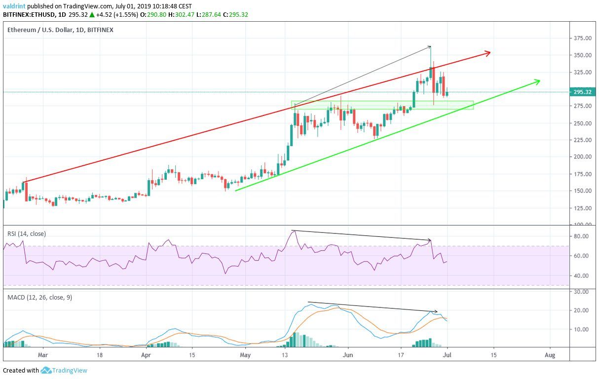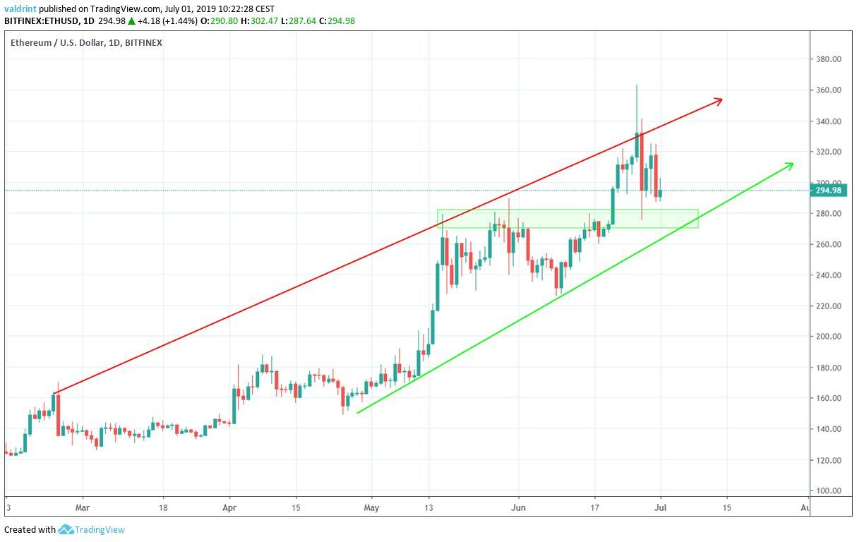 On June 26, 2019, the Ethereum price reached a high of $363.3. A rapid decrease ensued. The price of ETH reached lows below $285 the next day.