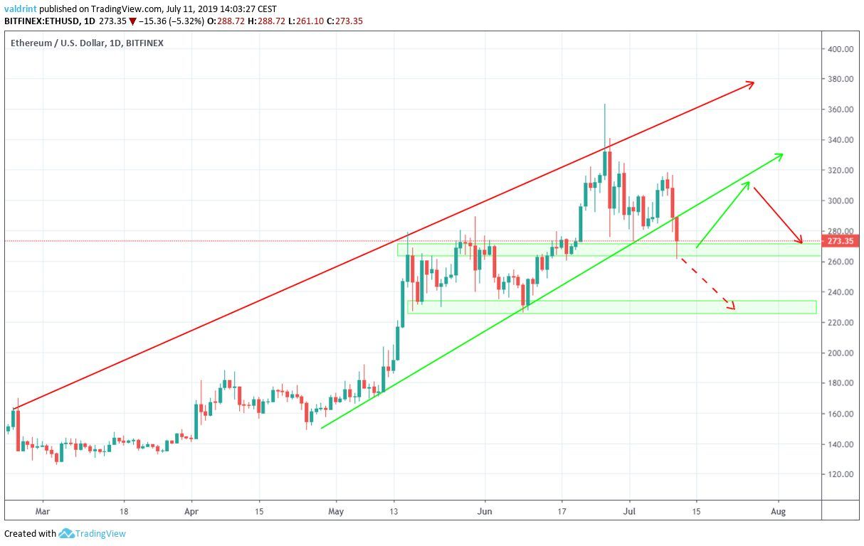 The second scenario has the Ethereum price continuing its decrease until it reaches the support area at $230.