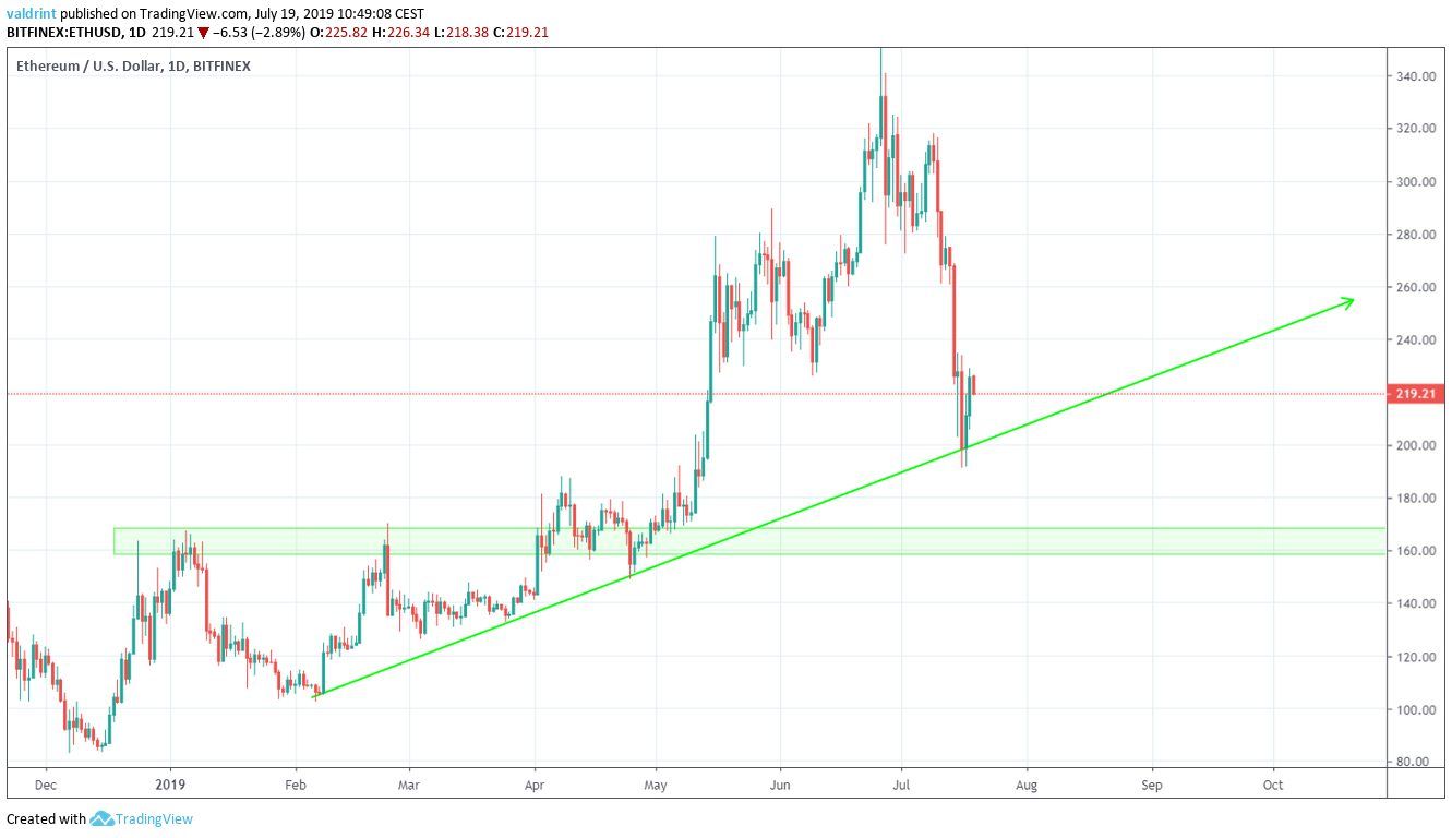 On July 15, 2019, the Ethereum price reached a high of $234,33. A decrease ensued. On July 17 and 18, the ETH price made a double bottom near $192, before beginning to increase.