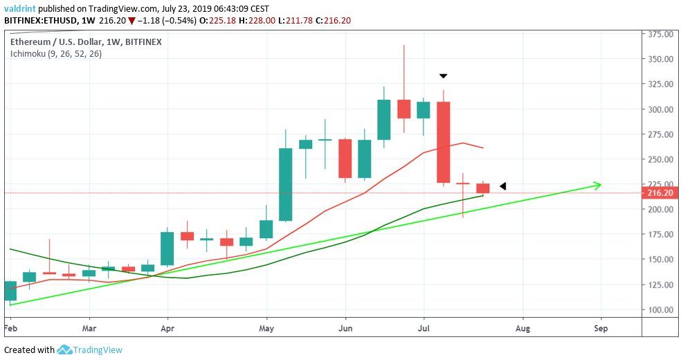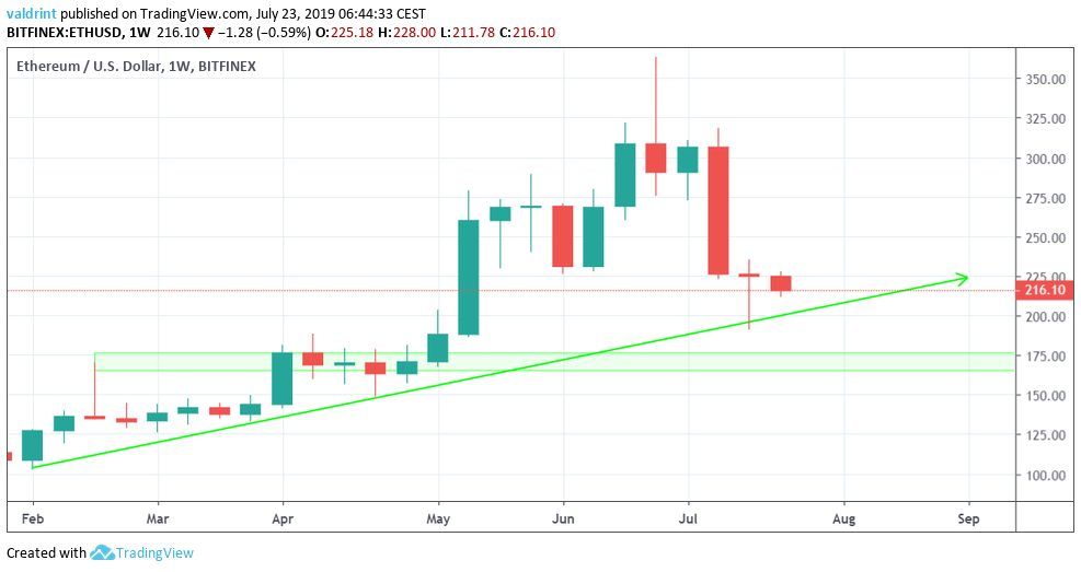 On July 17, 2019, the Ethereum price reached a low of $192. An uptrend began. On July 20, the ETH price reached a high of $236. It has been decreasing since.