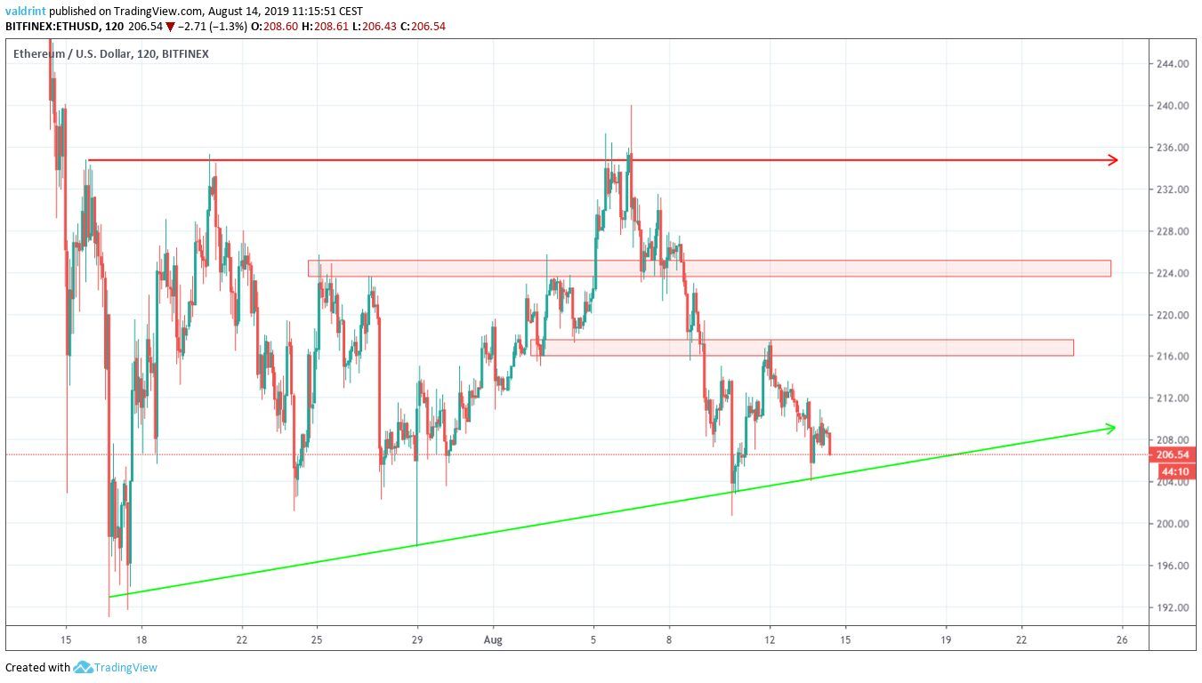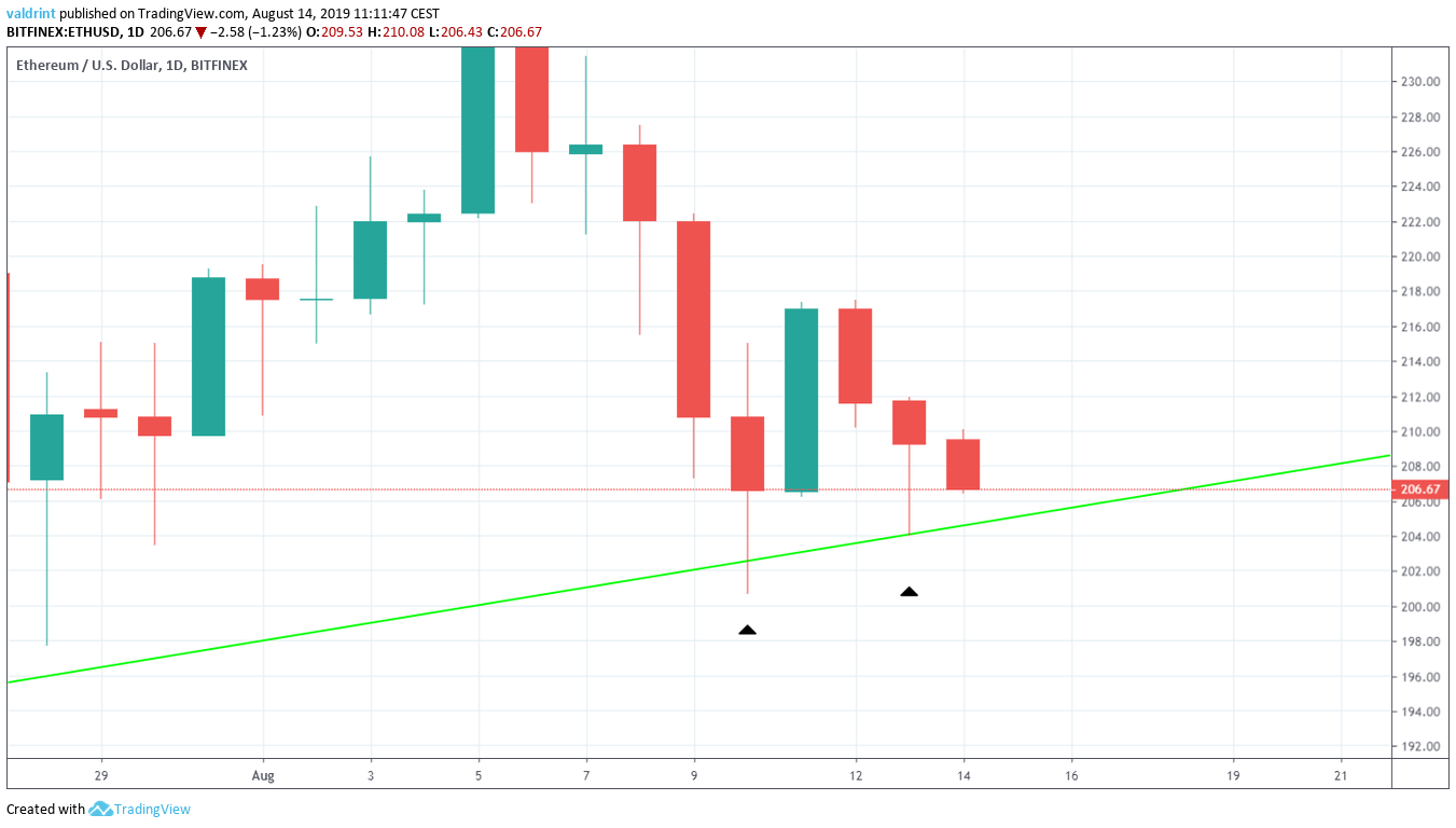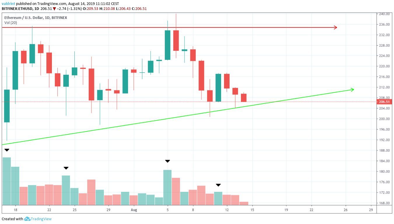 On August 6, 2019, the Ethereum price reached a high of $240. A downtrend began the same day. On August 10, the ETH price reached a low of $201. It has been increasing since then.