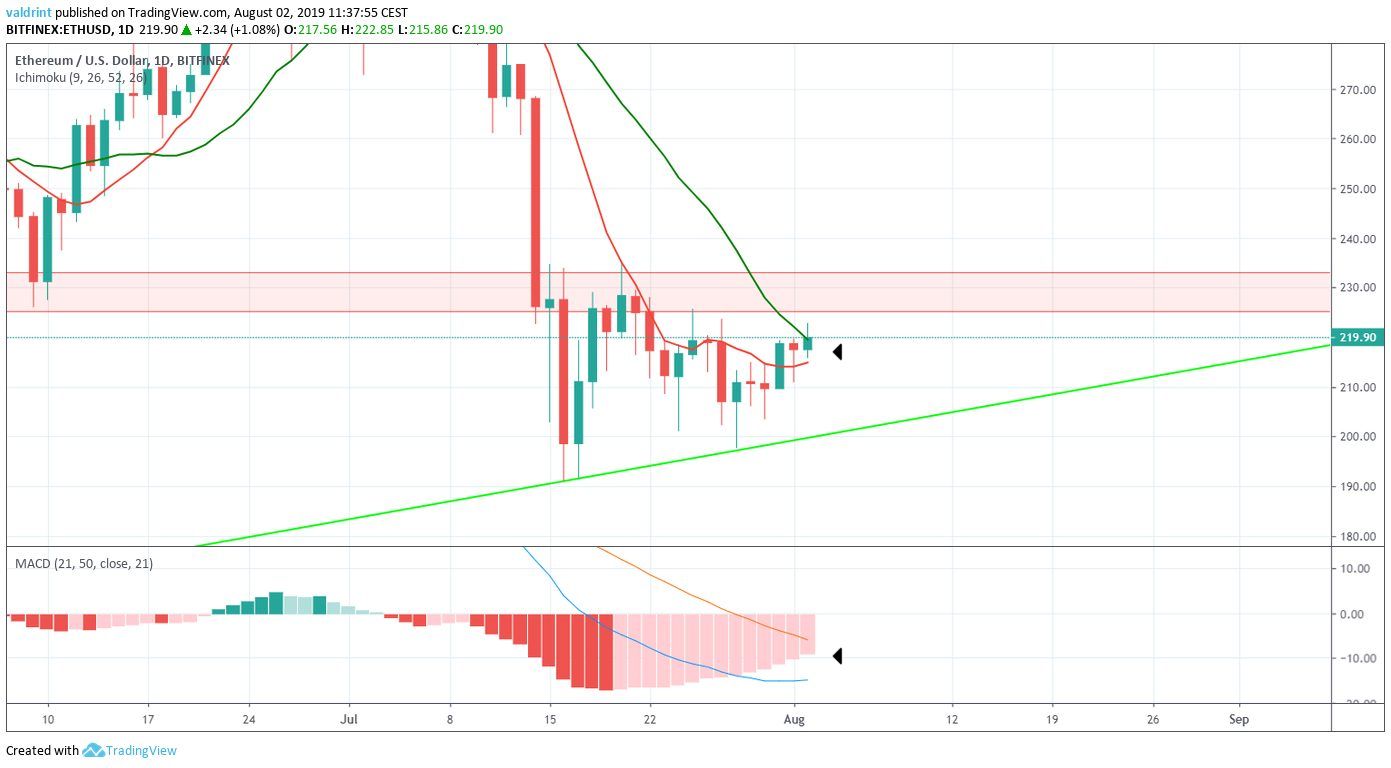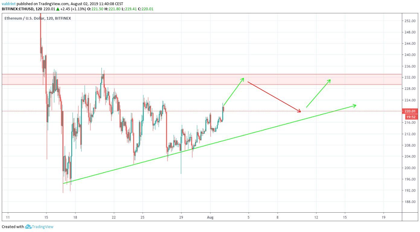 On July 17, 2019, the Ethereum price reached a low of $191.6. An upward move ensued. On July 20, ETH reached a high of $235.27. Since then, it has been decreasing, trading inside a range between $200 and $225.