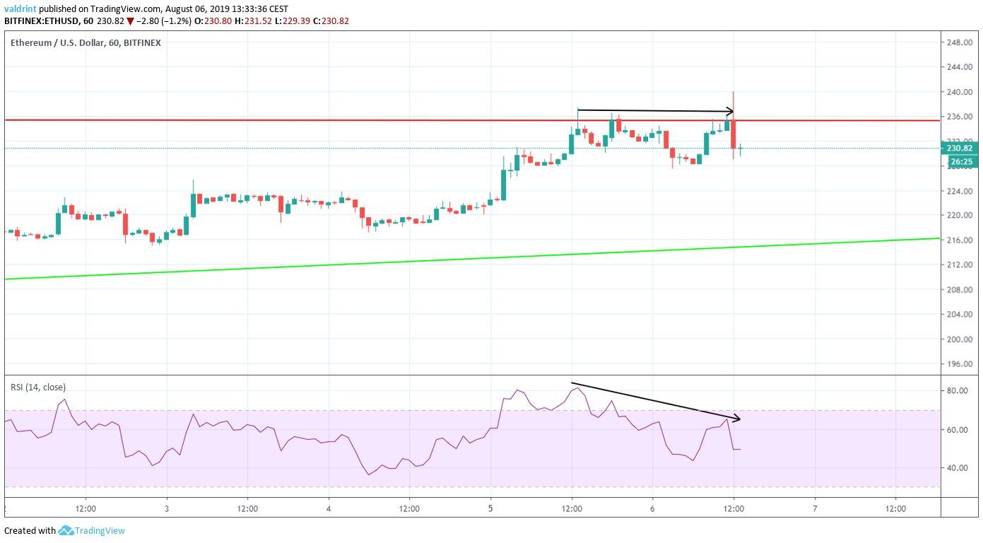 On July 30, 2019, the Ethereum price reached a low of $203. A gradual upward move ensued. On August 5, ETH reached a high of $236. On August 6, it increased to $240, before decreasing back to $230 in a matter of minutes.