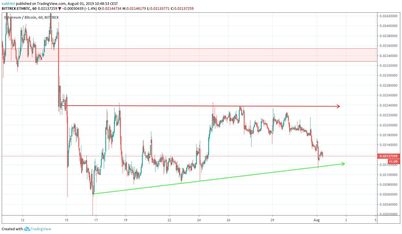 A look at the hourly time-frame shows that the ETH price has been trading inside an ascending triangle since reaching a low on July 16.