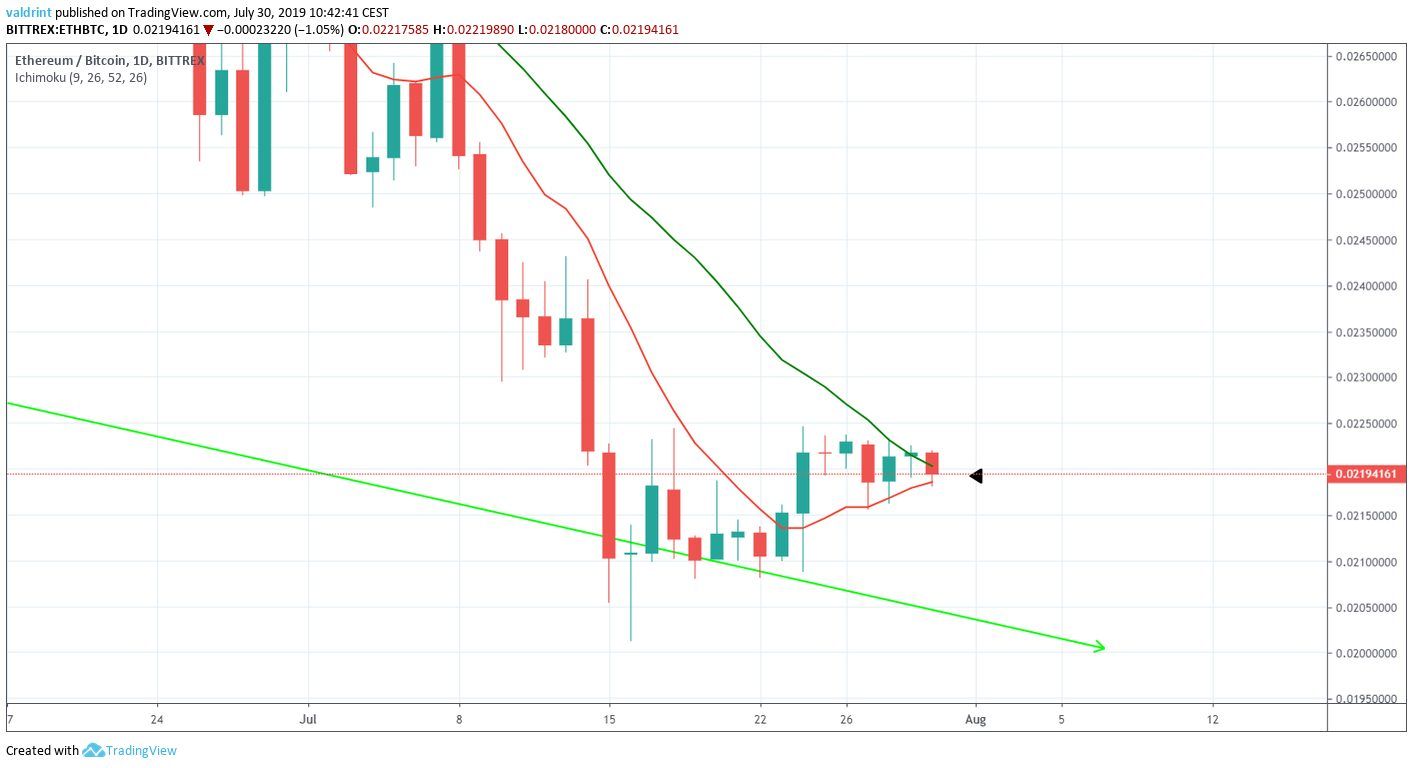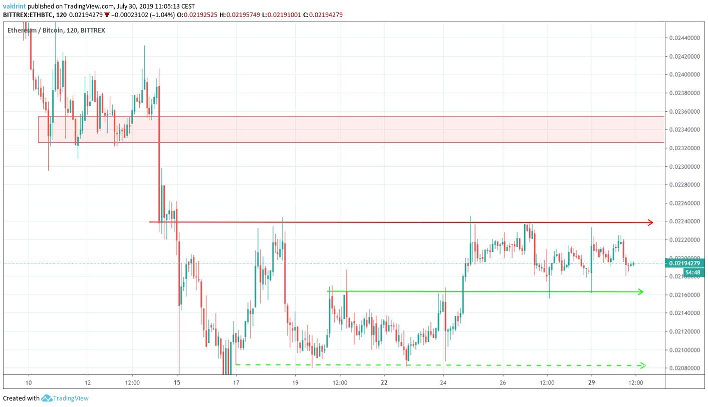 On July 16, 2019, the Ethereum (ETH) price reached a low of ₿0.020. An upward move began and the price reached a high of ₿0.0224 the next day. After a slight decrease, ETH reached similar highs on July 25. Since then, it has been trading in a range between ₿0.0221 and ₿0.0224.