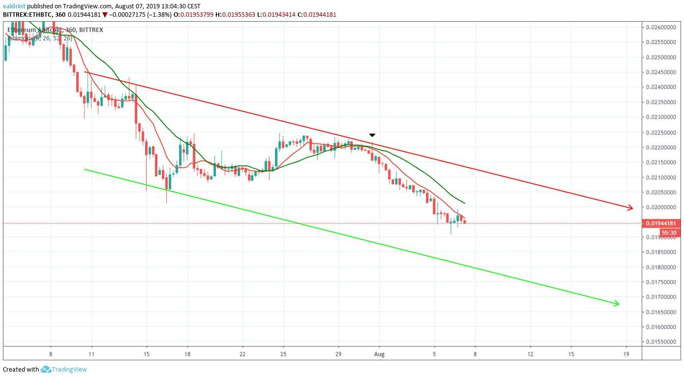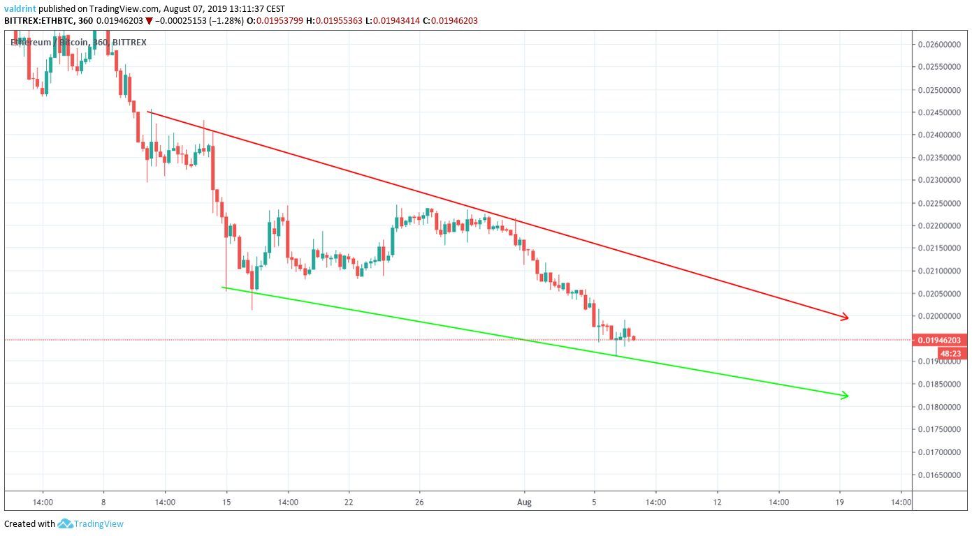 On July 16, 2019, the Ethereum price reached a low of ₿0.0201. An upward move followed. ETH reached highs of ₿0.0223 on multiple occasions. It has been decreasing since. On August 6, it reached a low of ₿0.0190.