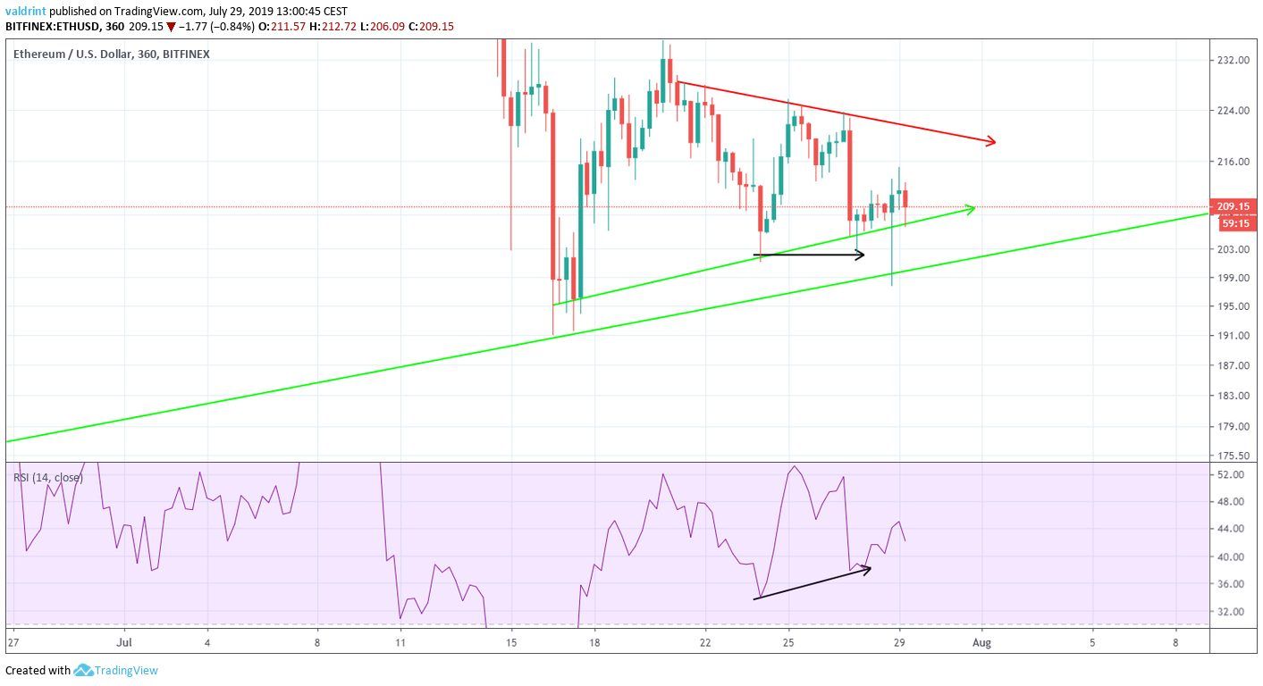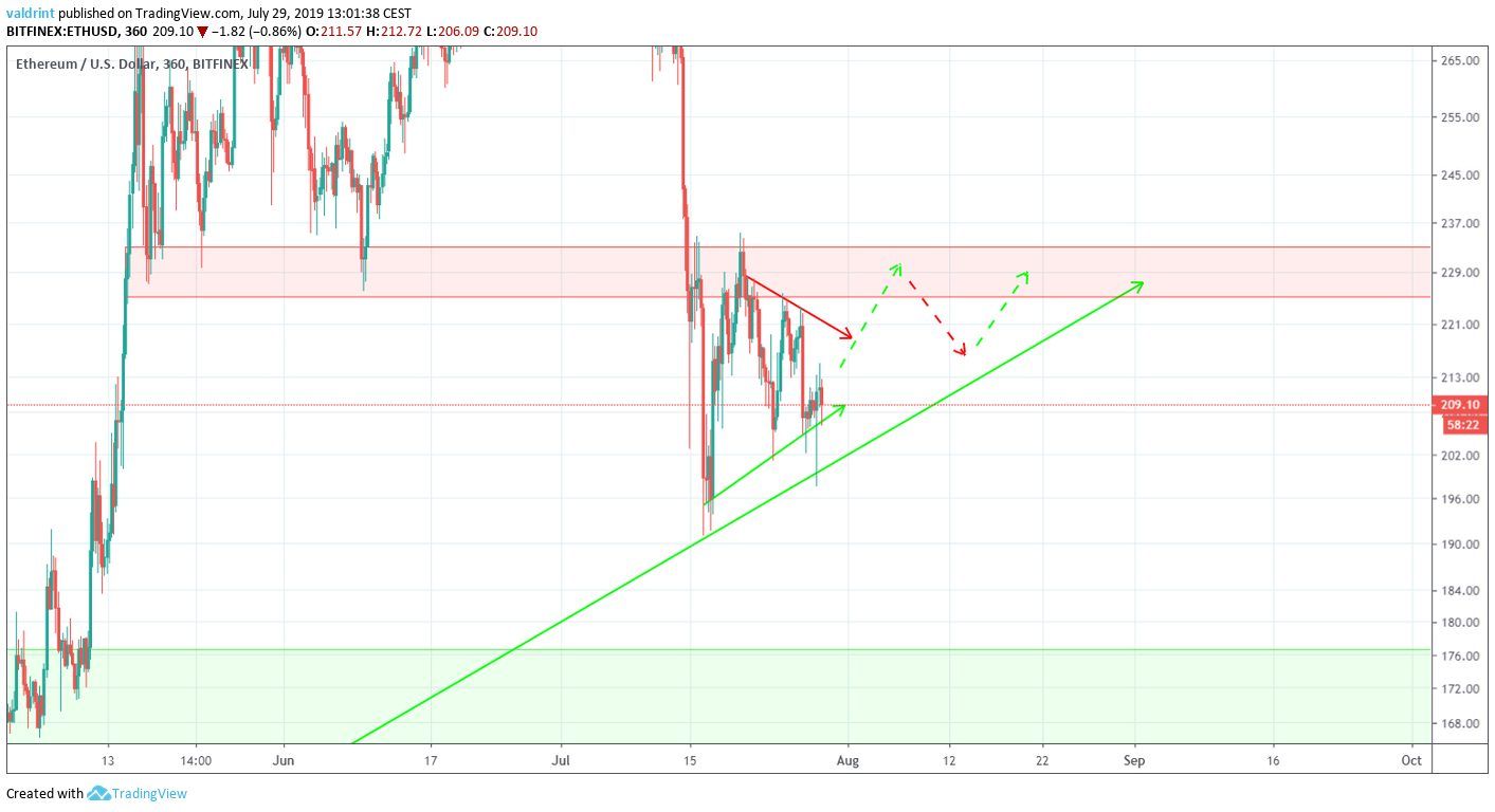 On July 17, 2019, the Ethereum (ETH) price reached a low of $191. An upward move ensued. On July 20, ETH reached highs of $235. Since then, it has been decreasing. The $201 level has been reached three times, on July 24, 27 and 28.