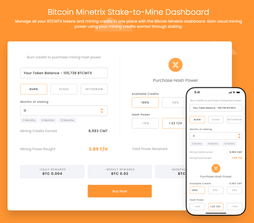This project aims to reshape cloud mining by letting users stake BTCMTX tokens to earn credits that are burned to access BTC mining power.