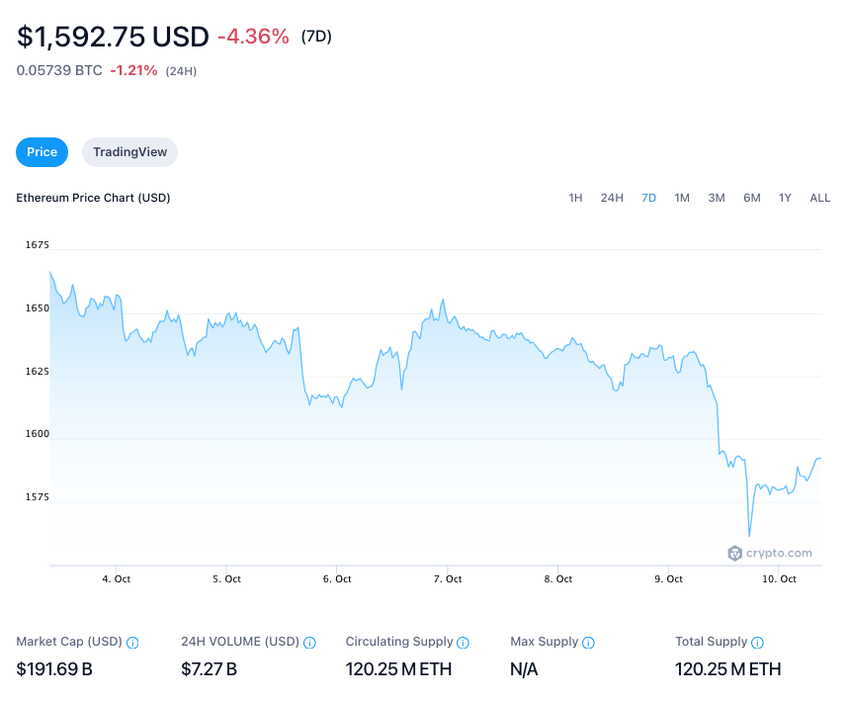 The price of Ethereum (ETH) has continued to decline over the past week, dropping below $1,600 as investor uncertainty grows.