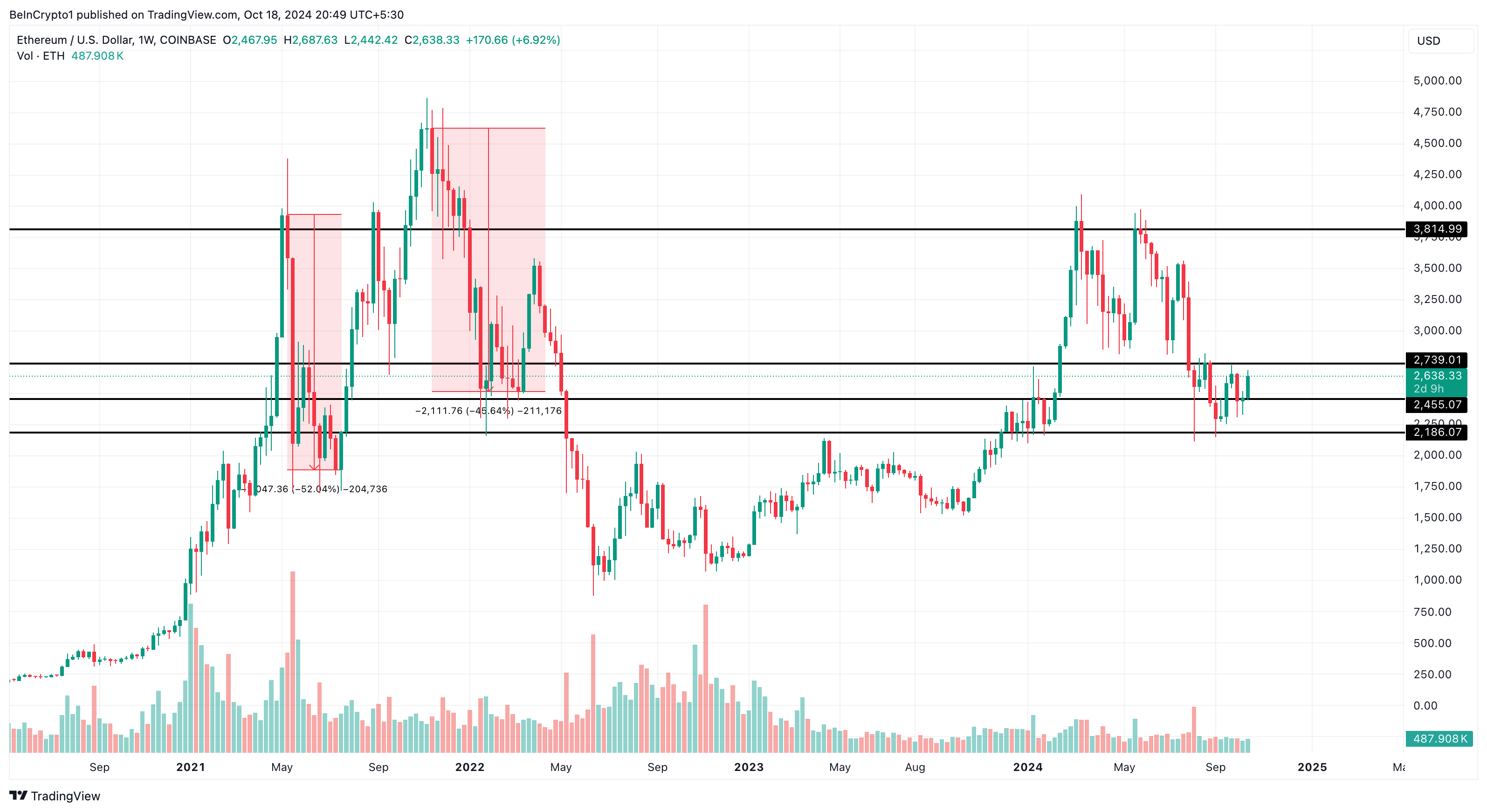 With a similar technical setup, it declined by 45% by November. Currently, ETH has been banking on the $2,455 support to prevent such an occurrence again. However, the low trading volume suggests that the cryptocurrency might fail to hold the support for long.