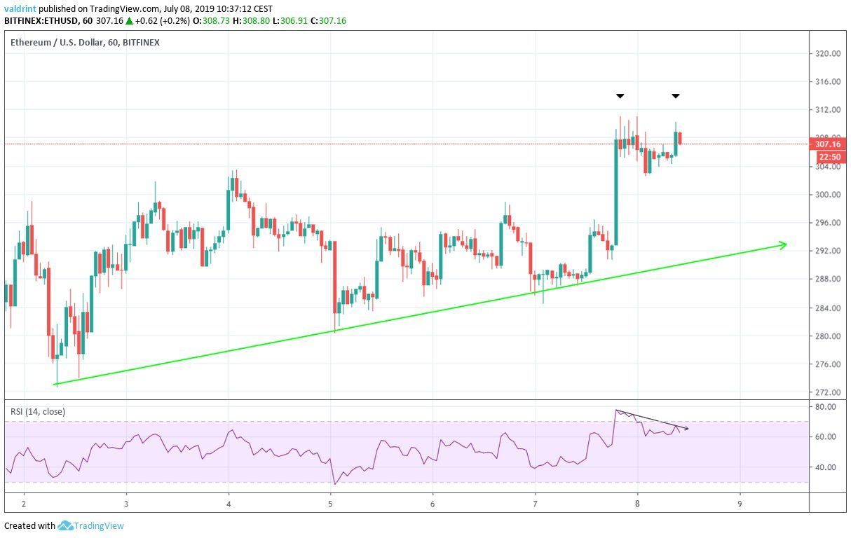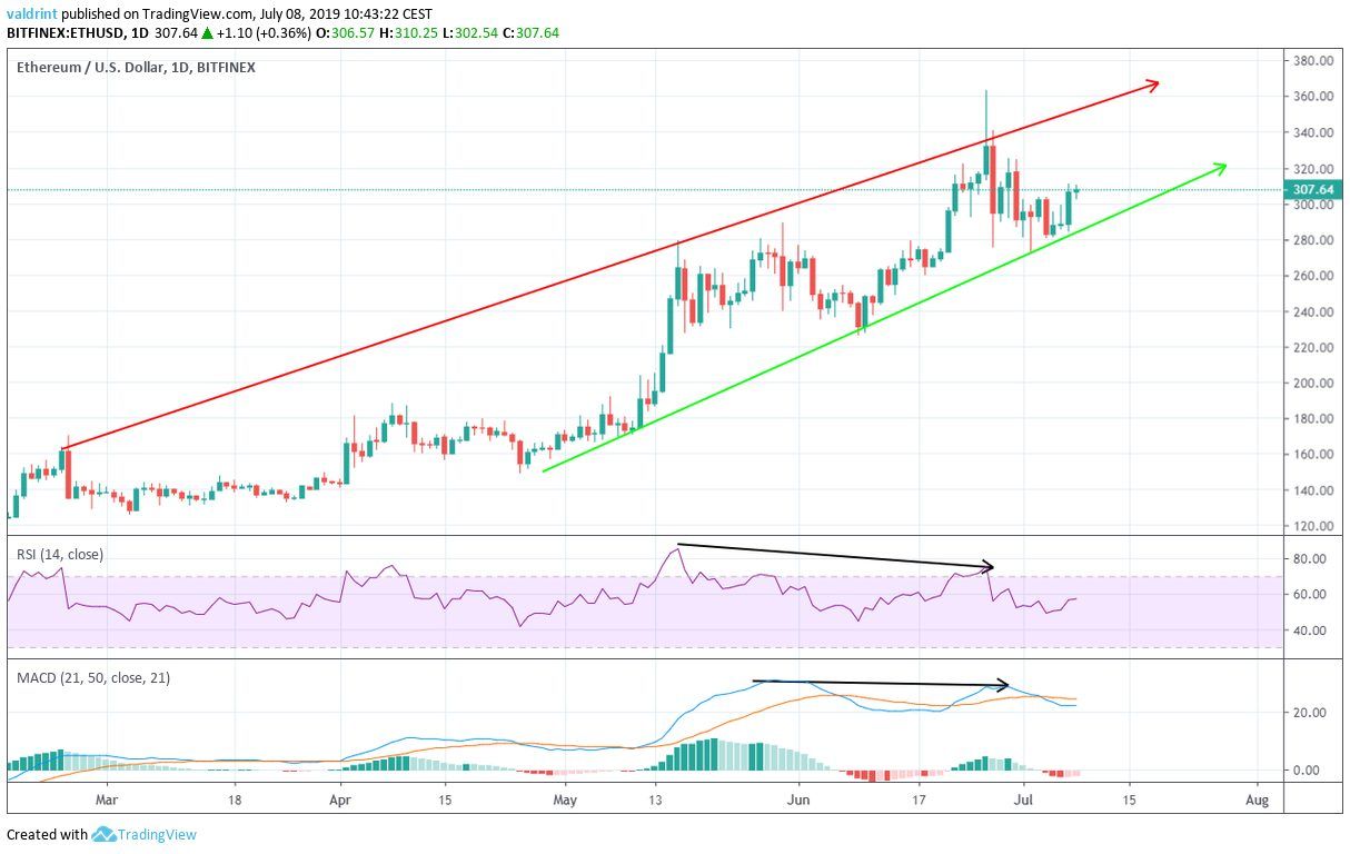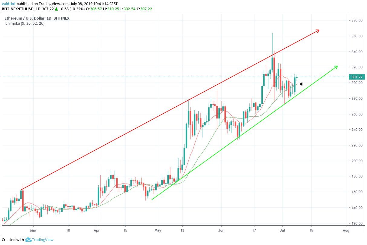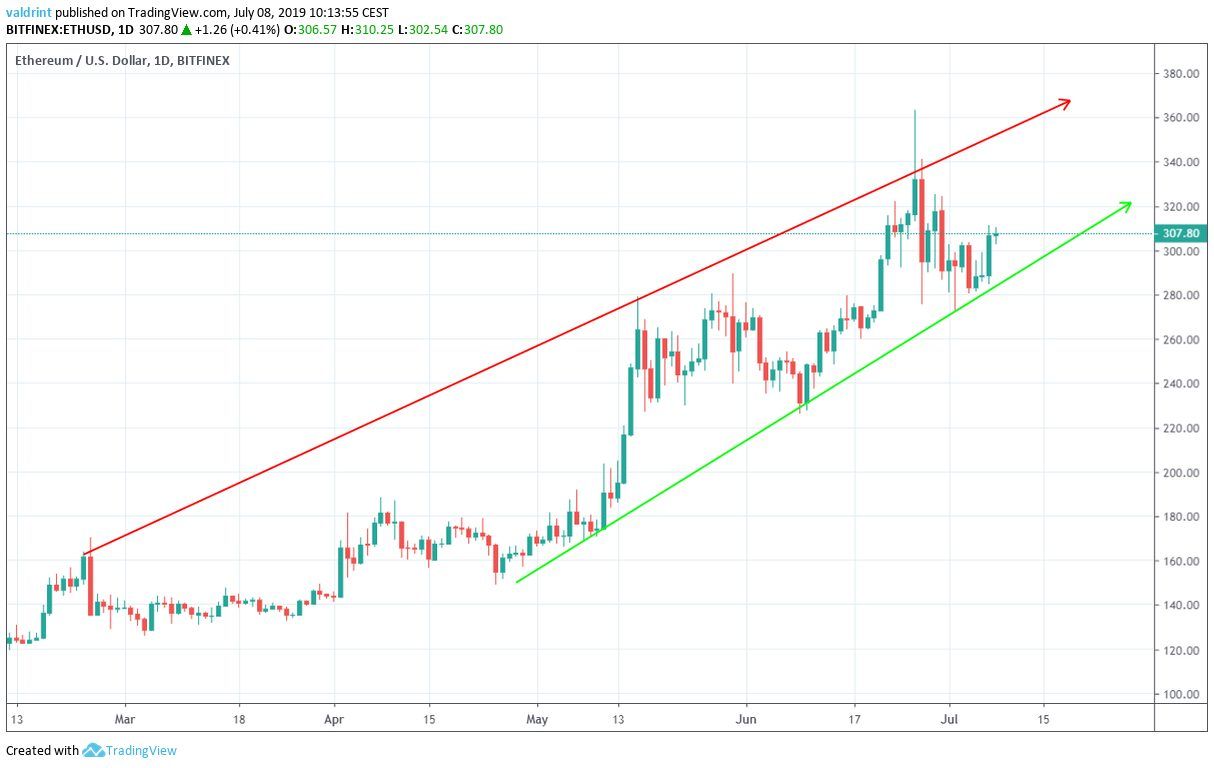 On June 30, 2019, the Ethereum price made a high of $325. A downtrend followed. On July 2, it reached a low of $272. The ETH price has been increasing since.