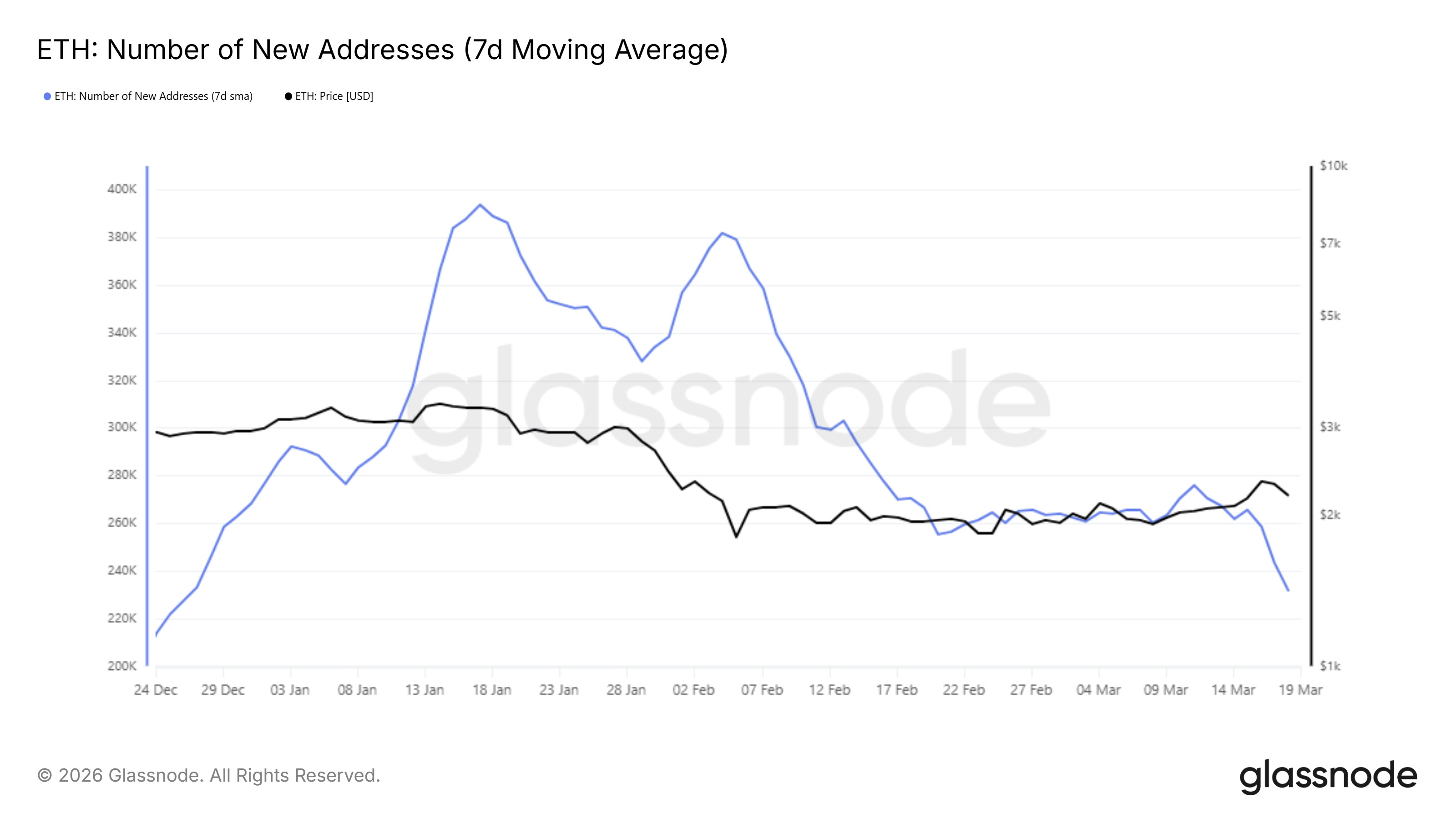 New address creation on the Ethereum network has dropped 16%, reaching a near three-month low of 231,867. This decline signals that potential new investors are stepping back rather than entering the market. The consistent losses experienced by existing holders appear to be deterring fresh participation, as new entrants are reluctant to buy into a persistently loss-generating asset.