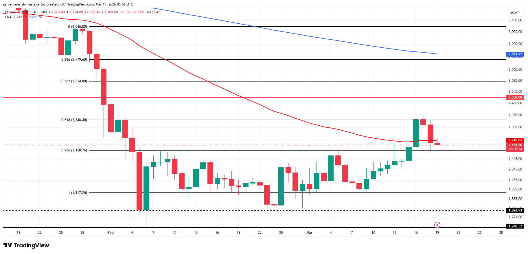Ethereum is trading at $2,189, holding above the $2,158 support level after losing the 50-day exponential moving average as structural backing. The loss of EMA support is a technically significant development, confirming that the short-term trend has deteriorated. This structural weakness makes the $2,158 floor the last meaningful defense before a deeper decline.