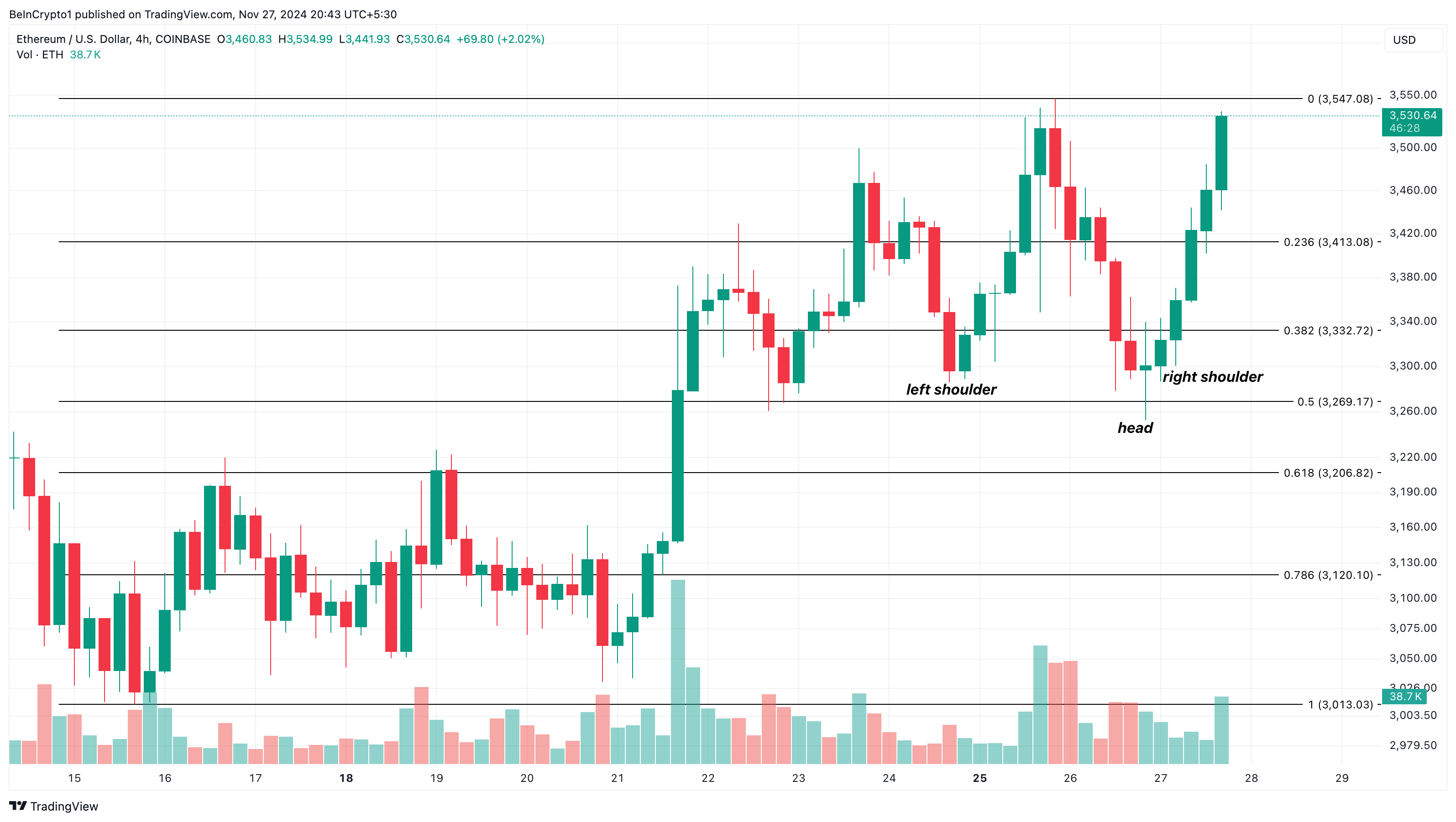On the daily chart, Ethereum’s price has formed an inverse head-and-shoulders pattern. This pattern typically emerges after a prolonged downtrend, signaling a potential sellers’ exhaustion point.