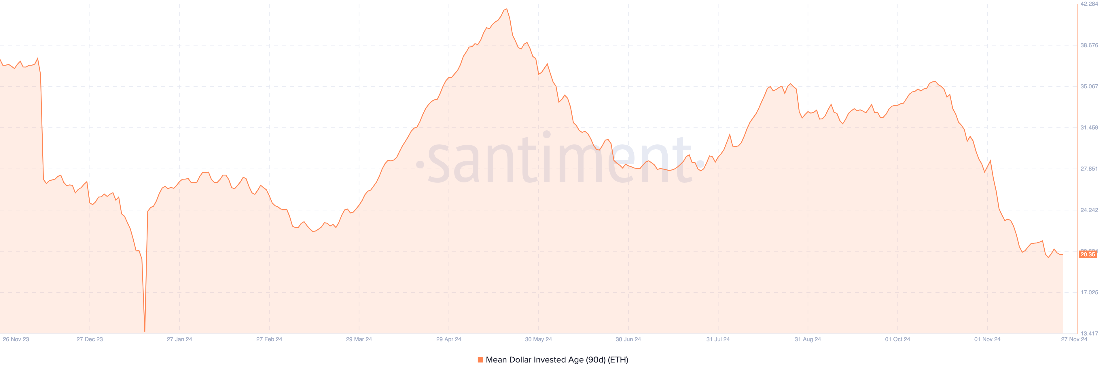 Beyond the MVRV ratio, the Mean Dollar Invested Age (MDIA) also suggests that Ethereum may avoid a further price drop. MDIA measures the average age of all coins on a blockchain, weighted by their purchase price.