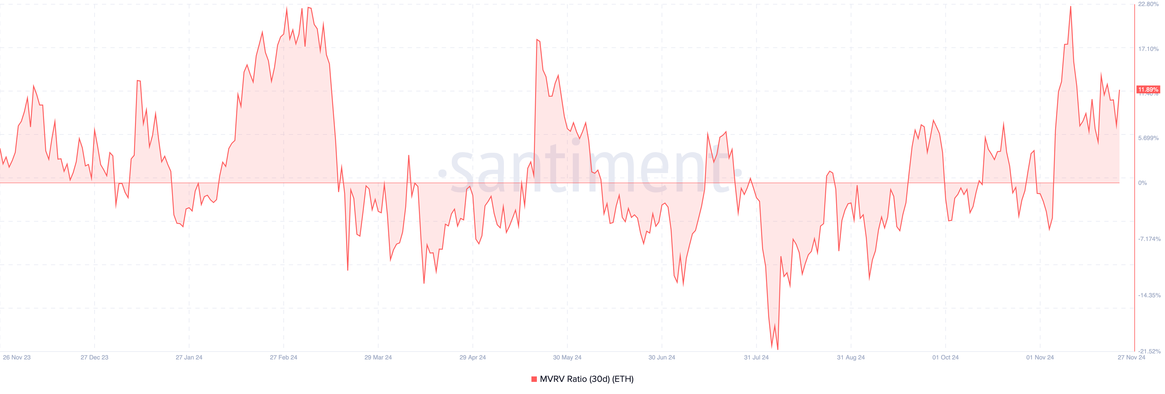 If the ratio hits an extreme low, it signals undervaluation, which can present an attractive accumulation opportunity for investors. For ETH, the 30-day MVRV ratio has risen to 11.89%. However, it remains below the typical local top range of 18% to 22%. This indicates that Ethereum still has room for further growth.