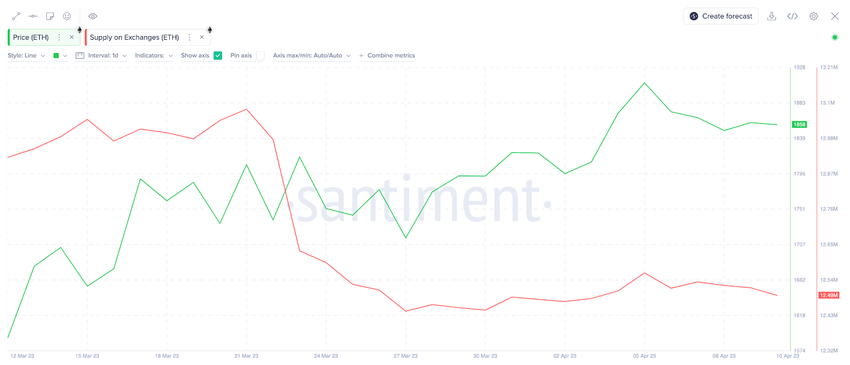 Between March 31 and April 10, ETH Supply on Exchanges has remained relatively unchanged at 12.49 million coins.Â
