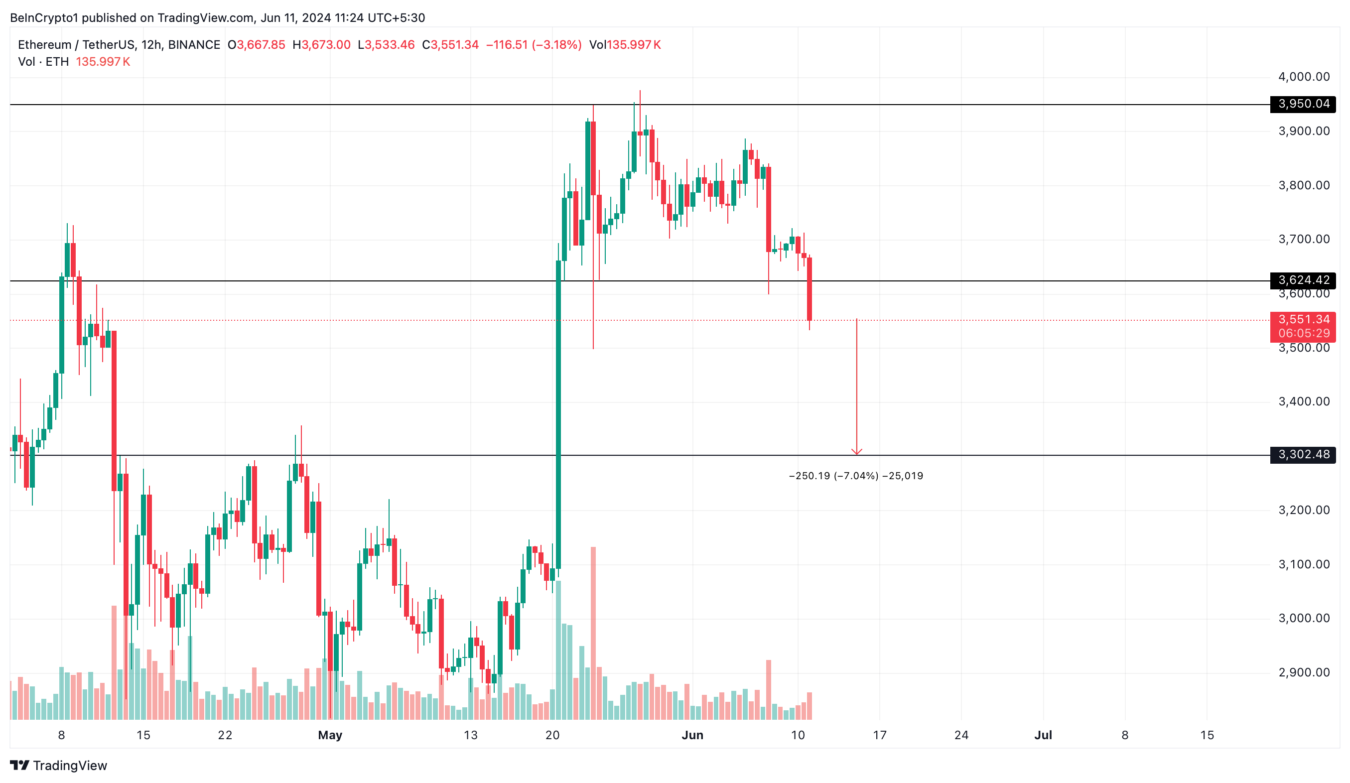 However, ETH faced challenges this Tuesday, trading at $3,551 and possibly breaking down from the established range. If this downward trend persists, Ethereum could find its next support level around $3,302.