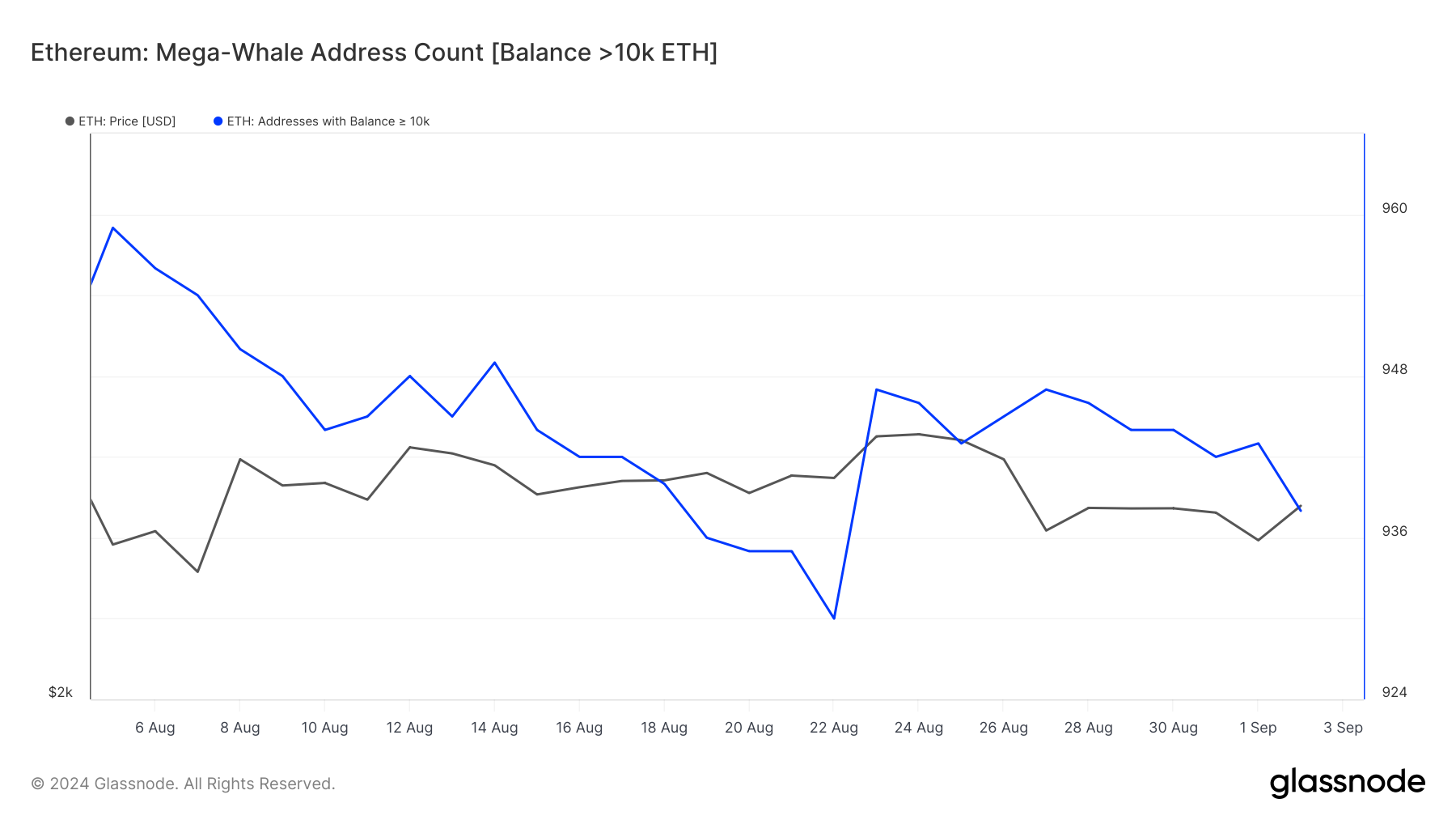 Furthermore. ETH’s price might continue to struggle. For instance, BeInCrypto examined the balance of the Mega-Whale ETH addresses using on-chain data from Glassnode. These addresses, holding over 10,000 ETH each, play a crucial role in price movements.