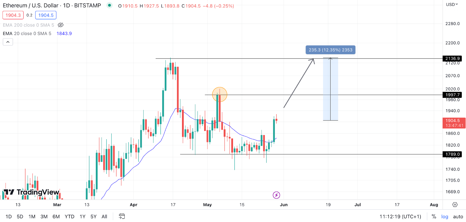 Currently, $ETH is trading just above the vital $1,900 level – the first time this level has been broken since early May.