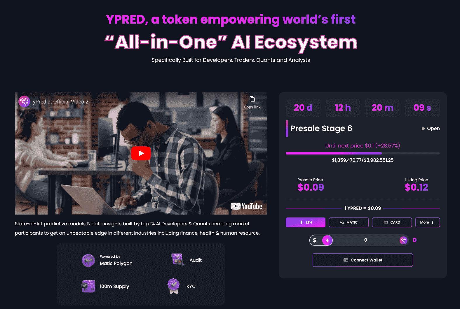 Early investors can buy $YPRED tokens for $0.09 – 33.33% lower than the planned exchange listing price of $0.12.