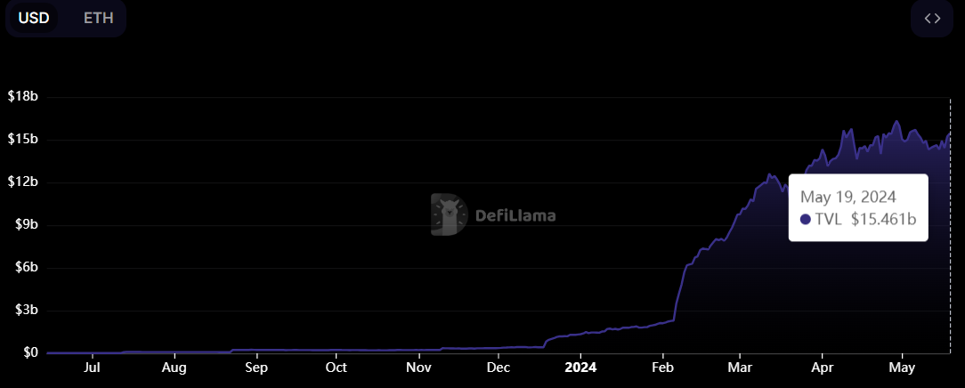 EigenLayer is a platform that enables users to re-stake their Ethereum to secure third-party networks. DeFiLlama data shows EigenLayer now has over $15 billion worth of total value locked (TVL) in the platform since its launch.
