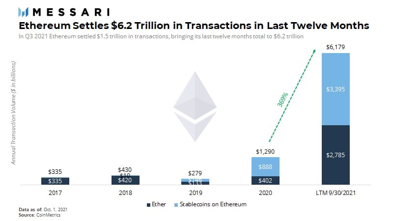 Ethereum settled over $6 trillion in transactions in the past 12 months, a 369% increase over 2020. $1.5 trillion worth of transactions were settled in Q3 alone.