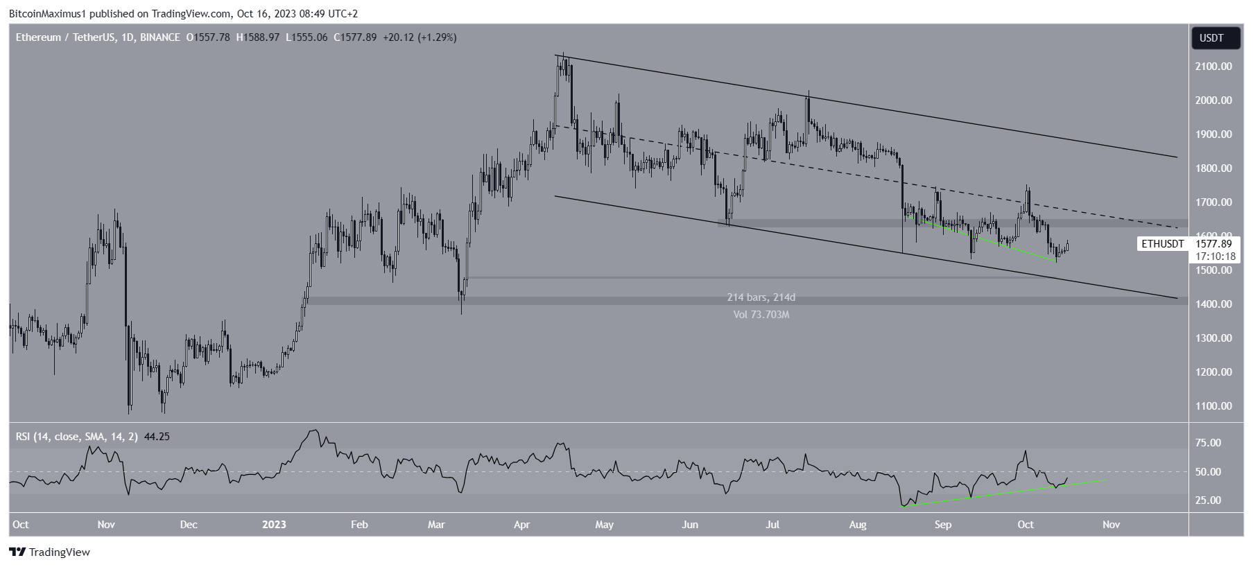 The decrease caused a breakdown from the $1,650 horizontal support area and led to a low of $1,521 on October 12. This was the lowest price in 214 days.