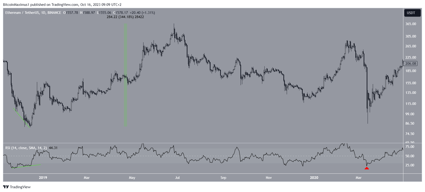 The RSI did not reach 20 even during its March 2020 ETH price crash (red icon).