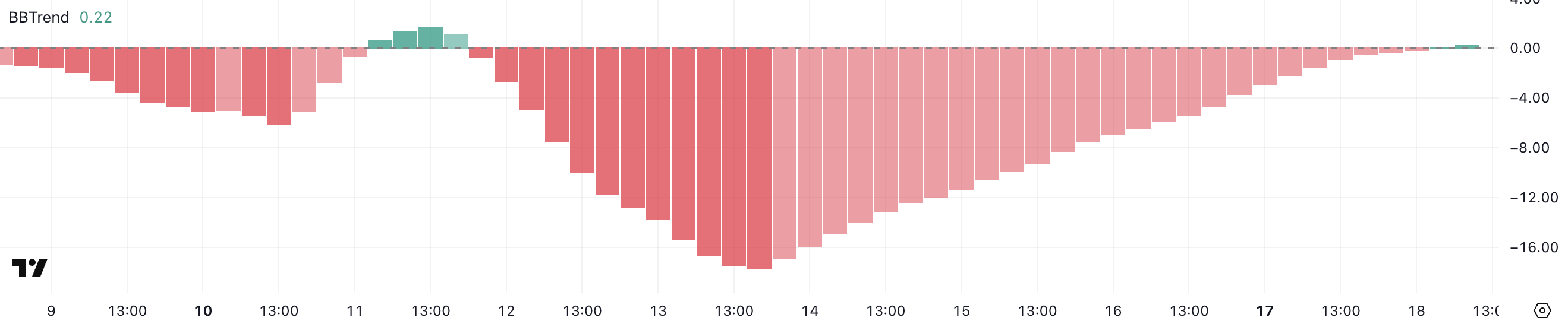 BBTrend, or Bollinger Band Trend, is a momentum-based indicator that measures the strength and direction of a price trend relative to its Bollinger Bands. Readings below 0 typically suggest bearish conditions, while readings above 0 indicate bullish momentum.