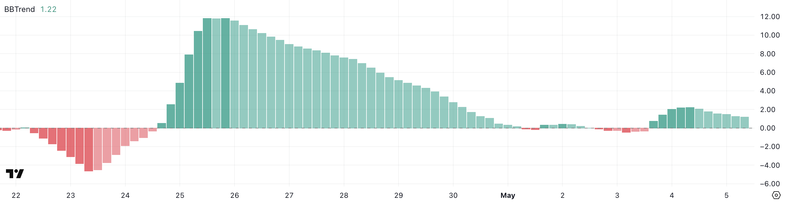 Values between -1.00 and 1.00 are considered neutral or trendless, signaling either sideways movement or weak conviction in either direction. The farther the BBTrend moves from zero, the stronger the trend, making values like 2.23 notable for trend confirmation.