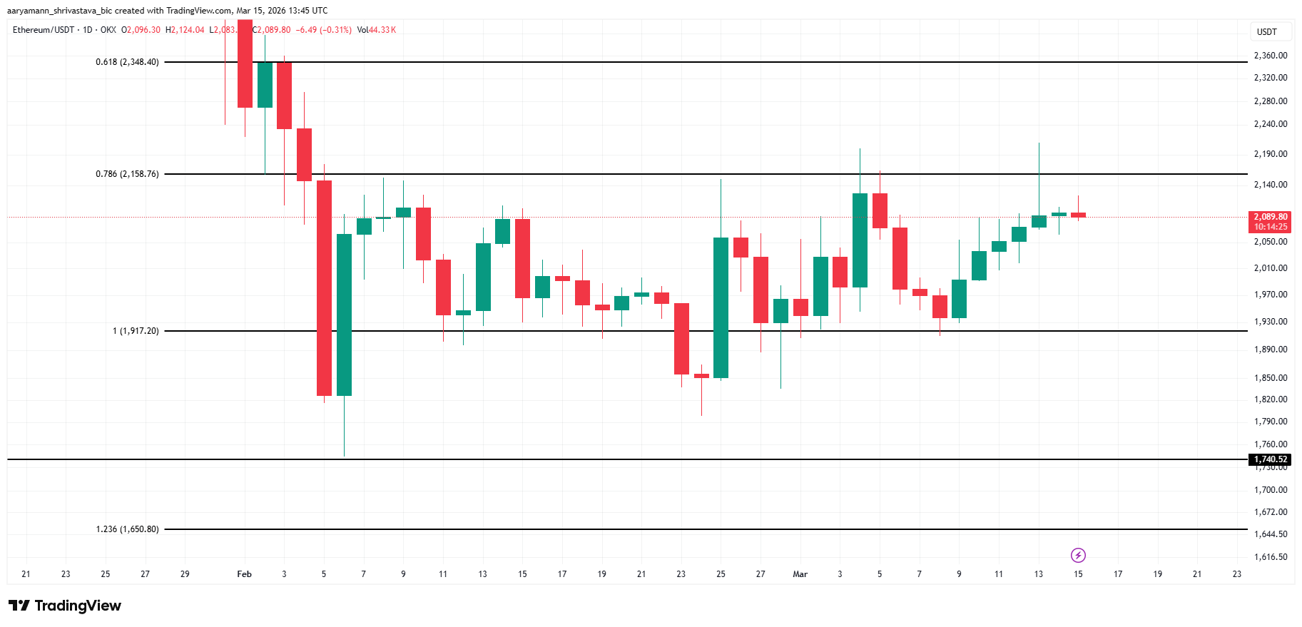 Ethereum price is trading at $2,089, rangebound between $2,158 resistance and $1,917 support for nearly a month. This well-established range reflects the persistent equilibrium between buyers and sellers. The consolidation is likely to continue as competing forces offset each other without a decisive catalyst to break the structure.