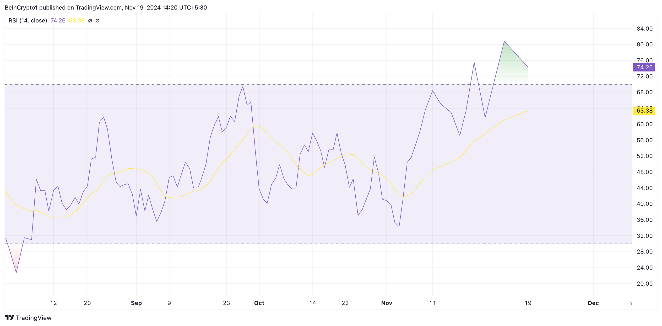 Additionally, the overbought readings from the coin’s Relative Strength Index (RSI) confirm the likelihood of a price correction in the short term. At press time, XTZ’s RSI is 74.26.