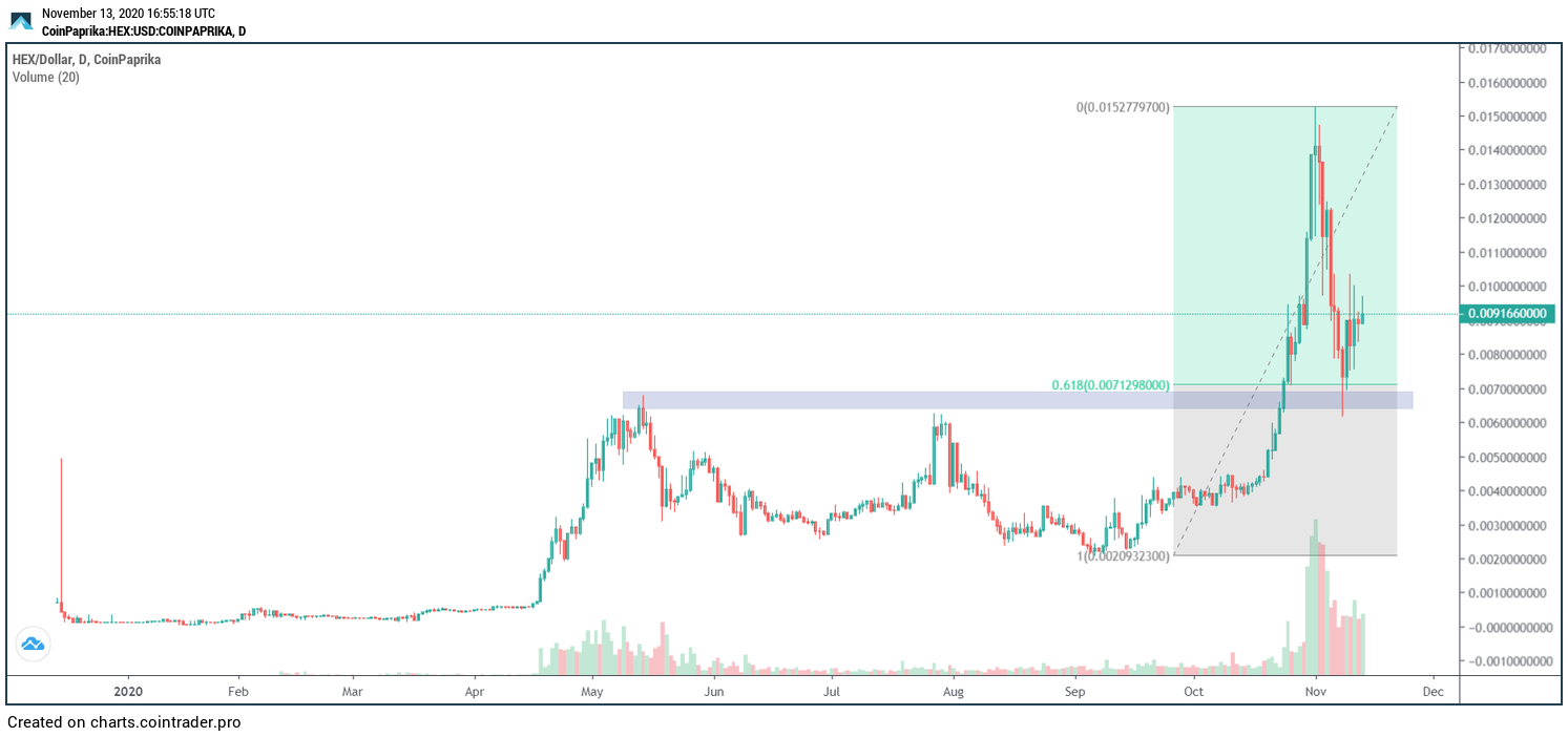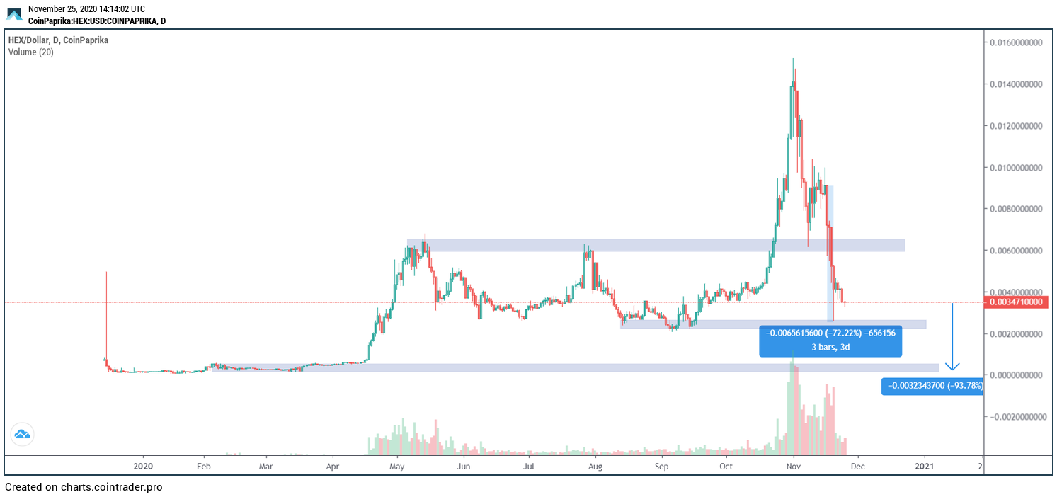 On Nov. 17, HEX began to decrease with significant volume and after three days, it lost 73 per cent of its value. Currently, the price is trading near the August – September support levels near $0.003, below which it has not traded since the beginning of the year.