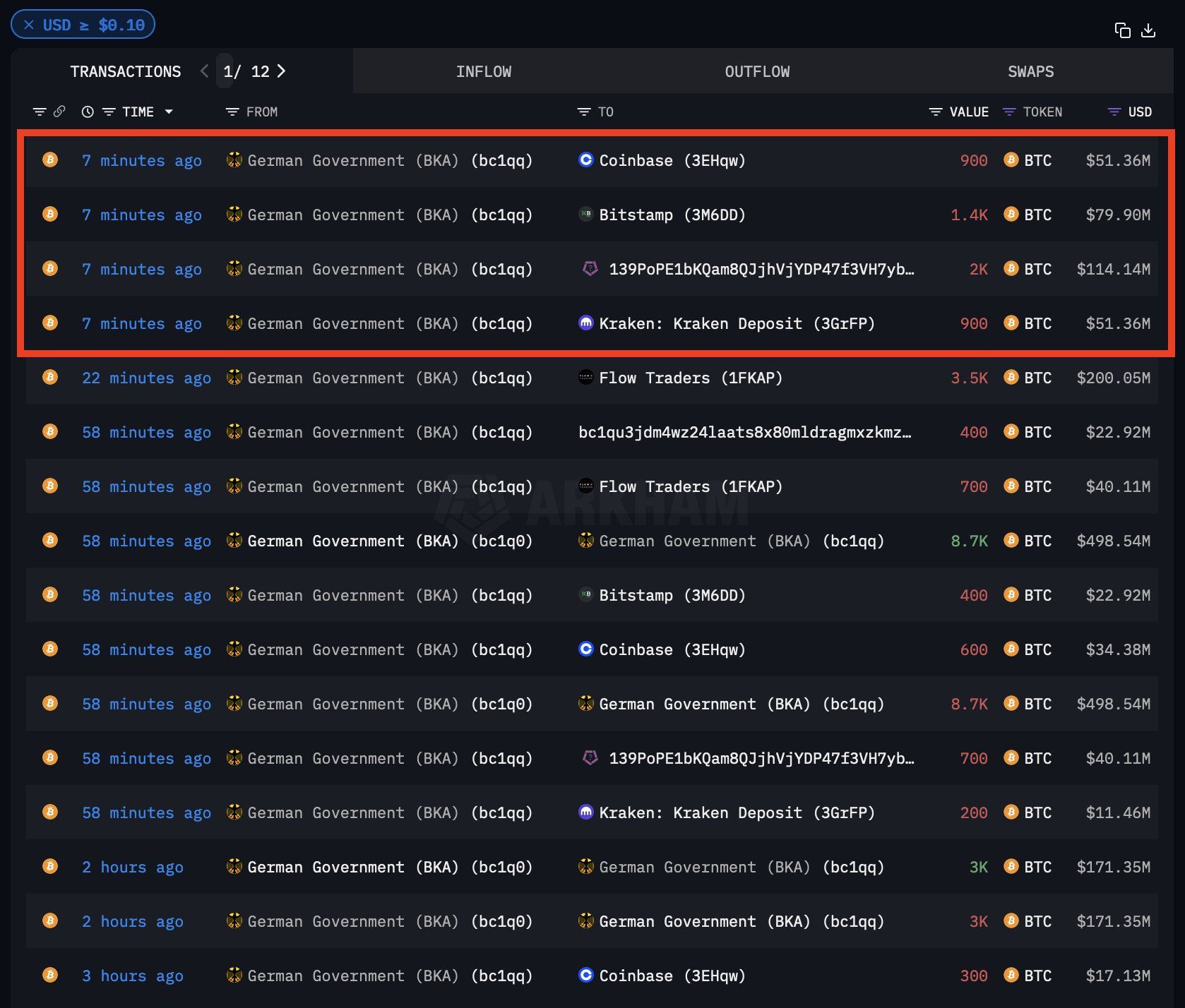 A few hours after the initial transaction, the German government sent an additional 8,100 BTC, valued at $463.2 million, to exchanges and market makers, including $200 million to Flow Traders. Shortly after this second batch, another 5,200 BTC, or $297.3 million, was sent to Kraken, Bitstamp, Coinbase, and 139Po.