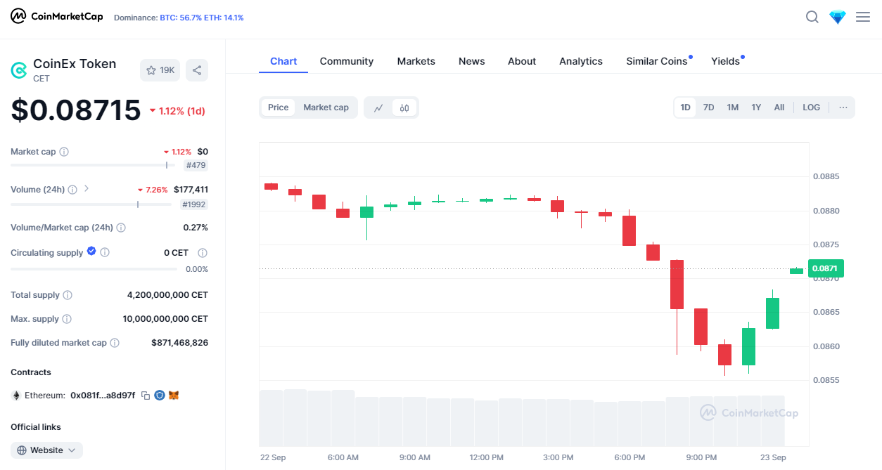 $CET is also used to pay for the transaction or trading fees on the CoinEx Chain. At the time of the writing, the price of $CET is $0.08713 with a market cap of $871,351,766 and a circulating supply of 2.9 billion tokens. However, $CET is only listed on CoinEx and only allows you to trade it in three pairs: CET/USDT, CET/BTC, and CET/USDC.
