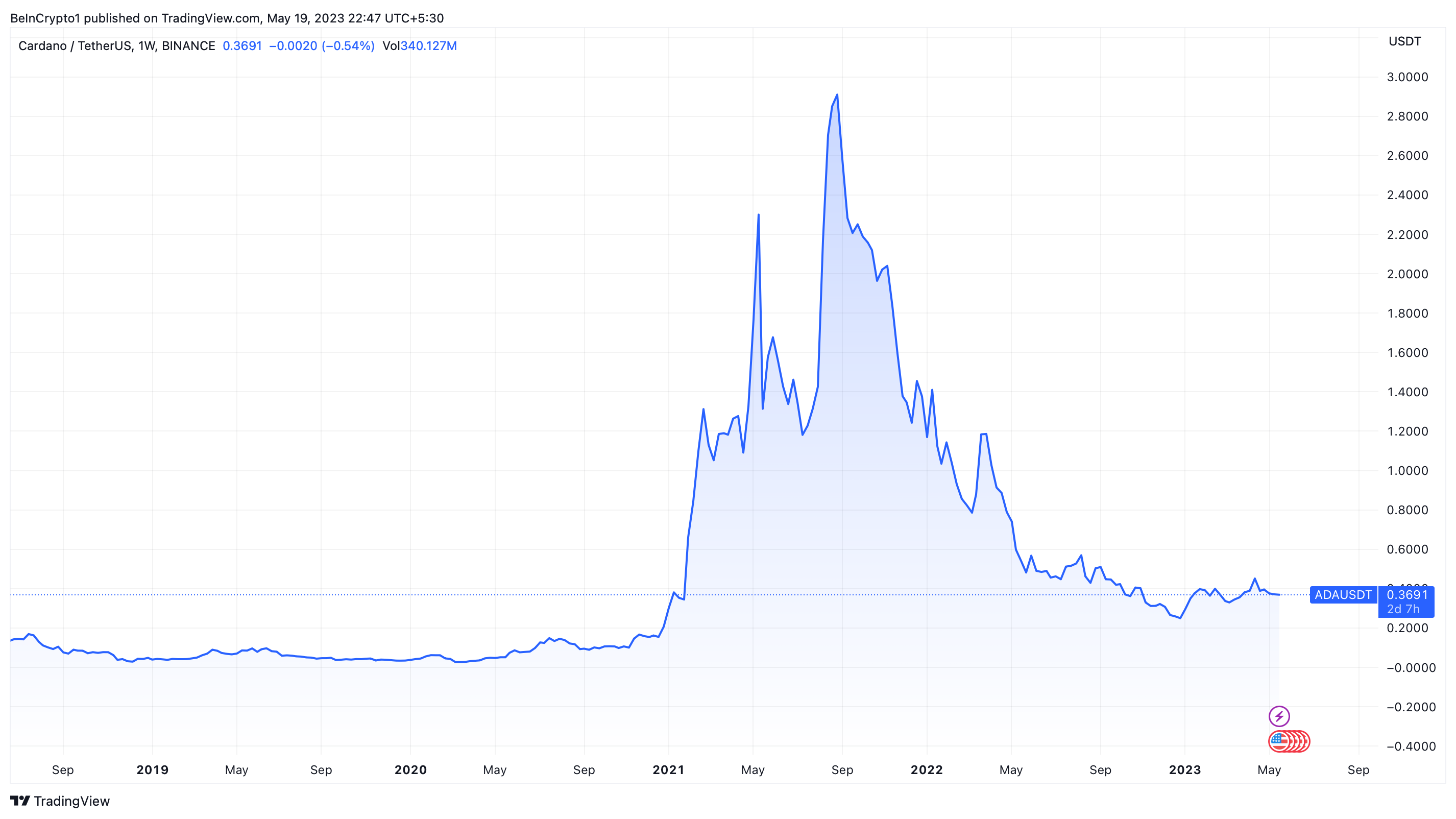 SponsoredHowever, external factors combined to exert downward pressure on the entire crypto market in 2022 led to a significant drop in Cardano’s value. By mid-2023, the coin had depreciated by 84% from its September 2021 peak, hovering around $0.37.