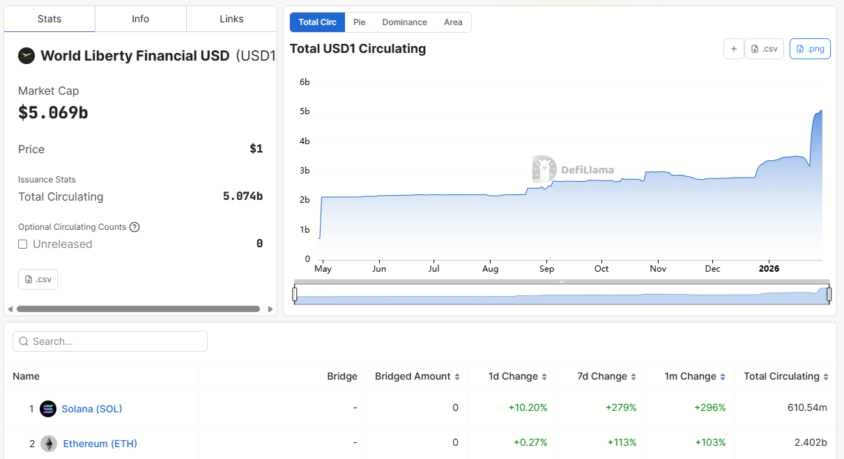According to DefiLlama, USD1 — a stablecoin linked to World Liberty Financial — has seen dramatic growth in January. Total market capitalization has surged above $5 billion, with more than $610 million circulating on Solana alone.