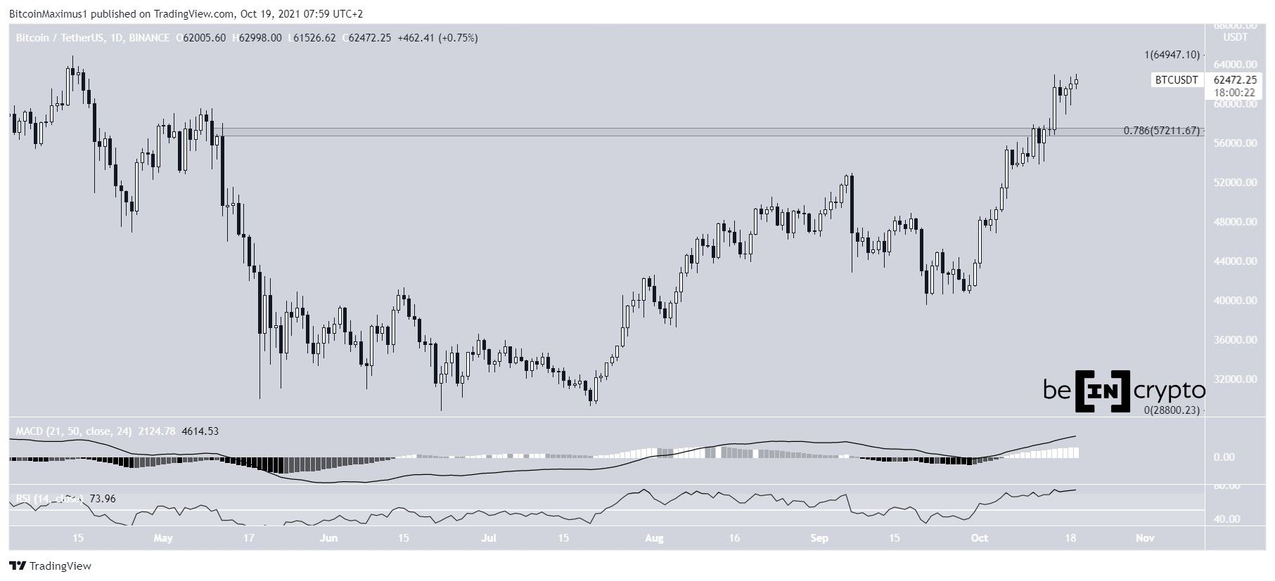 The daily chart for BTC has been showing a bullish outlook since the breakout from the $57,200 resistance area on Oct 15. This was both a horizontal resistance area and the 0.786 Fib retracement resistance level. Furthermore, it’s the final resistance area prior to passing the $64,854 all-time high price.