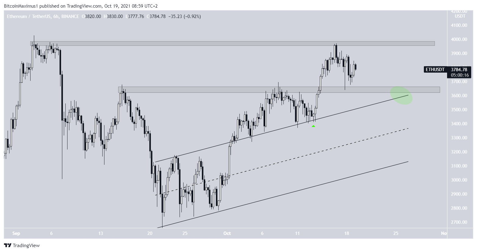 ETH has been moving upwards at an accelerated rate since breaking out from an ascending parallel channel and rebounding from its resistance line on Oct 13 (green icon). Now, the previous resistance line is expected to act as support.