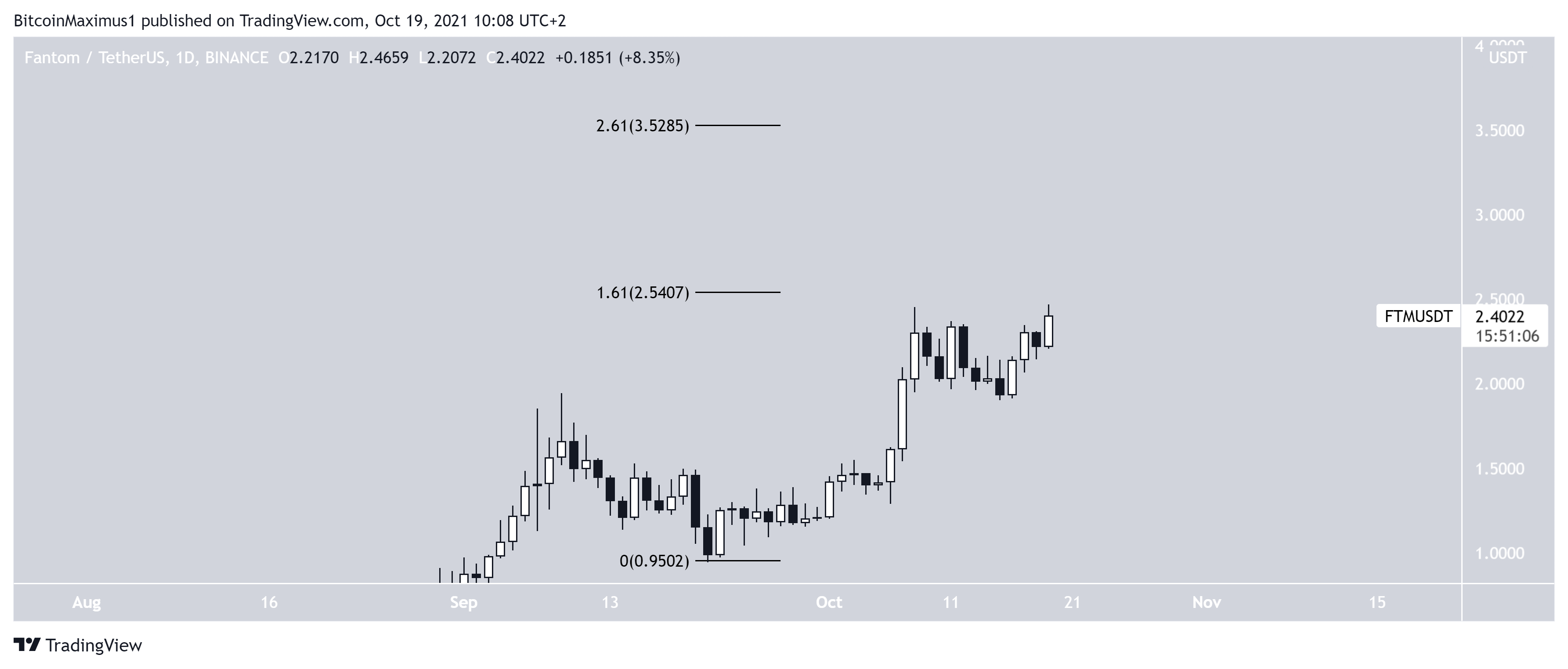 FTM has been moving upwards at an accelerated rate since Sept 22. On Oct 8, it reached a then all-time high price of $2.45.