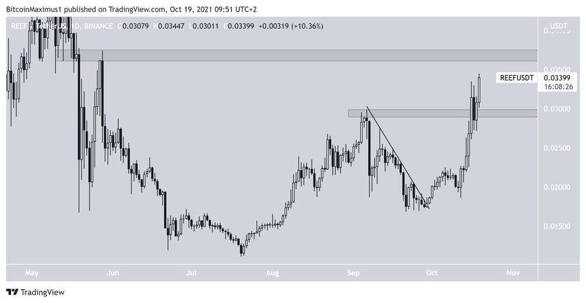 REEF has been moving upwards since breaking out from a descending resistance line on Sept 30. This signaled that the previous downward move had come to an end. After creating a higher low on Oct 12, it began to accelerate quicker.