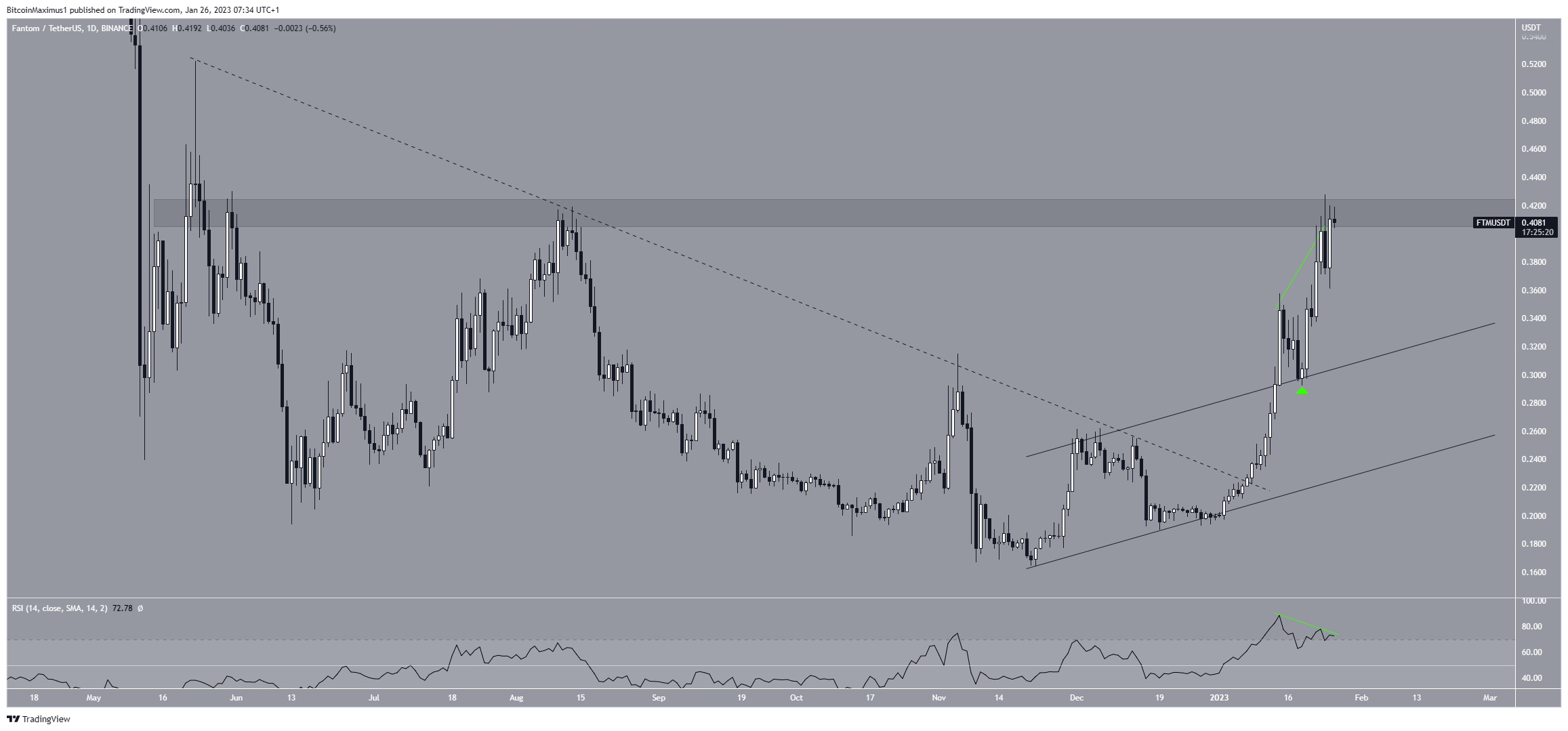 Despite a bullish reversal in 2023, the Fantom (FTM) price is struggling to move above the $0.41 resistance area. A pullback may occur before the upward movement resumes.